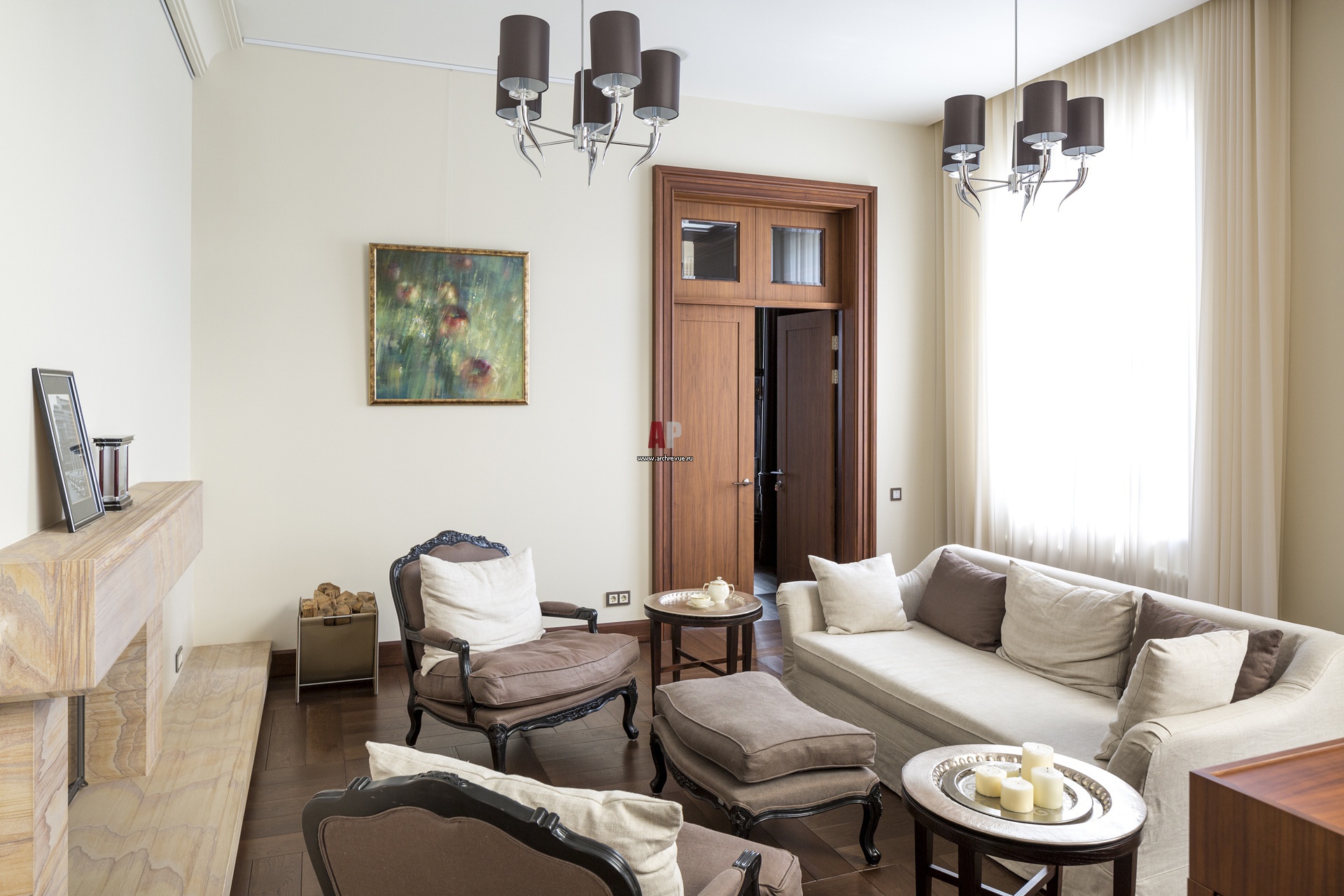 Интерьер зоны отдыха с камином в помещении гостиной первого этажа загородного дома. Стены в доме выкрашены однотонной краской сильно разбеленного цвета хаки с бархатной фактурой. На этом фоне красиво смотрятся двери из шпона американского ореха, индивидуальное изготовление, компания «АФ Ника».