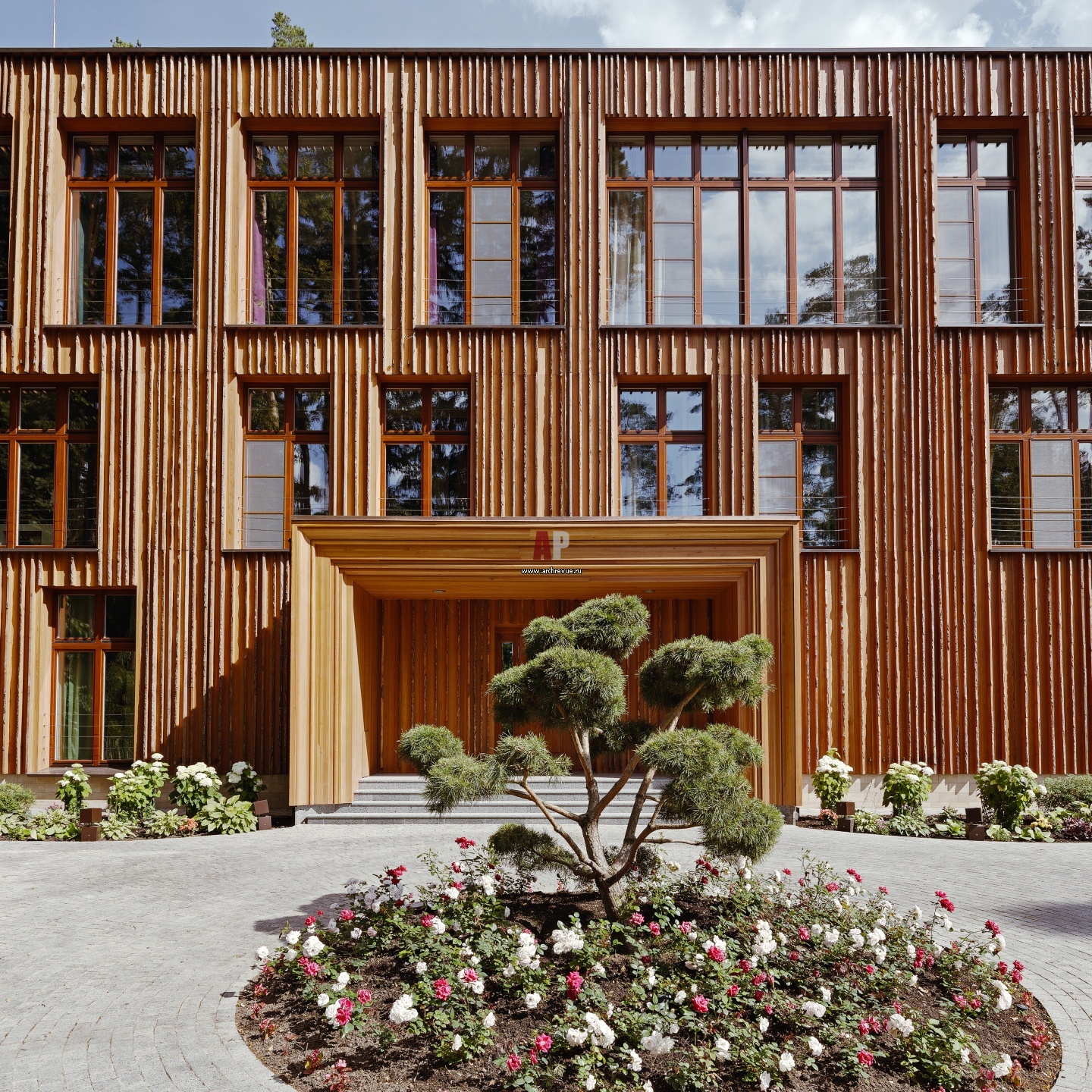 Портал из клееного бруса лиственницы является своего рода цитатой основоположника классицизма Андреа Палладио.