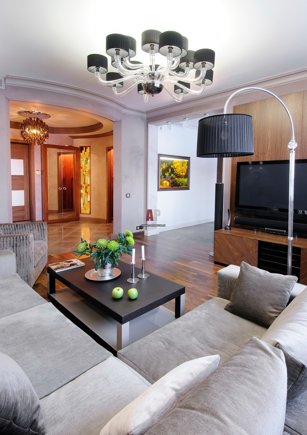 Вид из гостиной на круглый холл. На полу – массивная доска из ореха, поставщик «Мир Паркета». Стойка под ТВ выполнена на заказ, шпон ореха, вставки из черного лака.