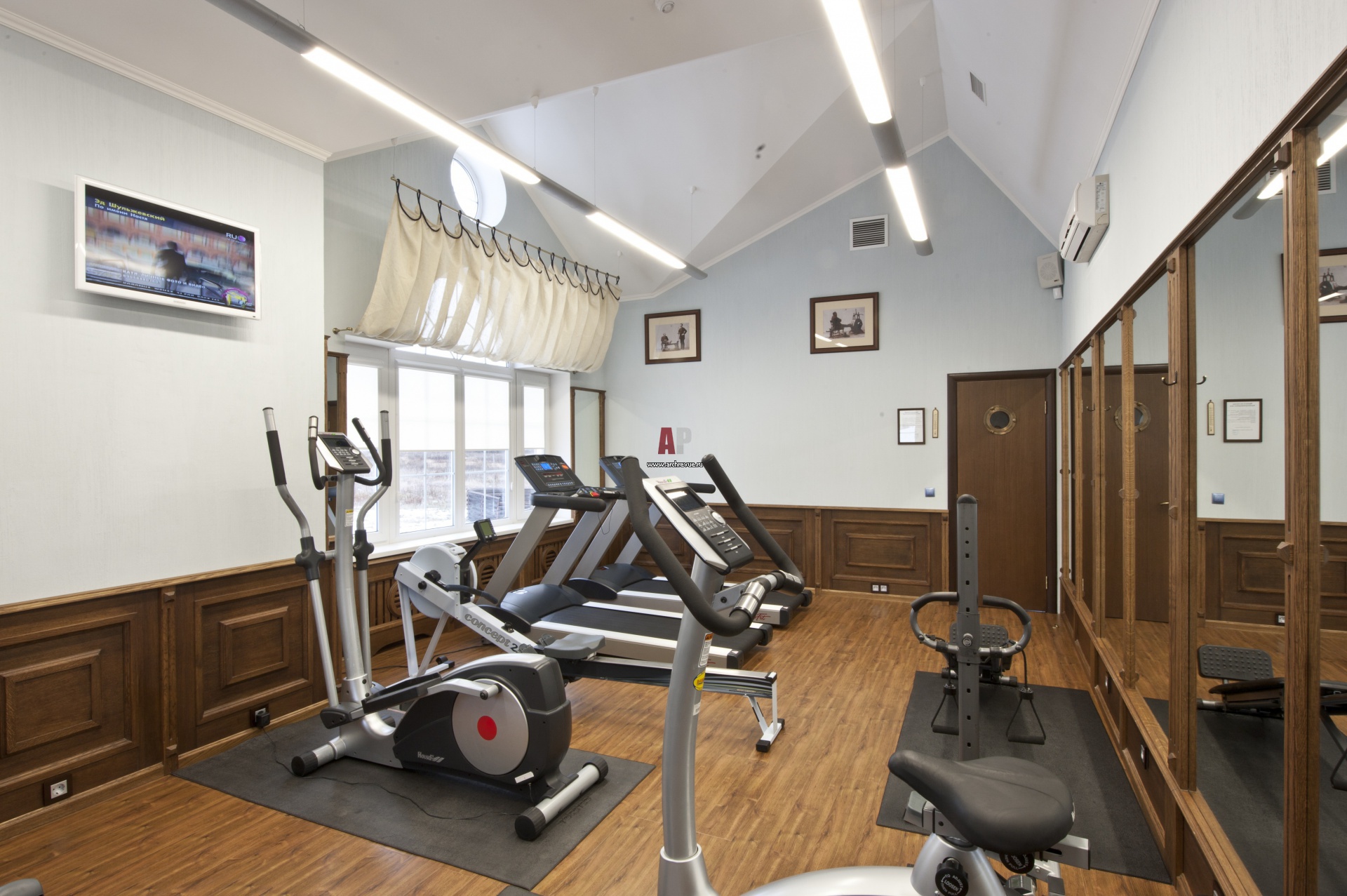 Дизайн интерьера тренажерного зала в загородном спортивном комплексе.