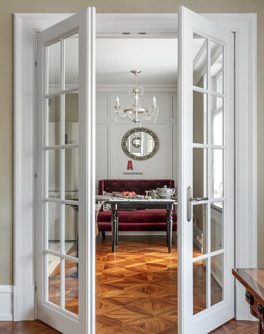 Вид из гостиной на кухню через классические филенчатые двери с прозрачными витражами.