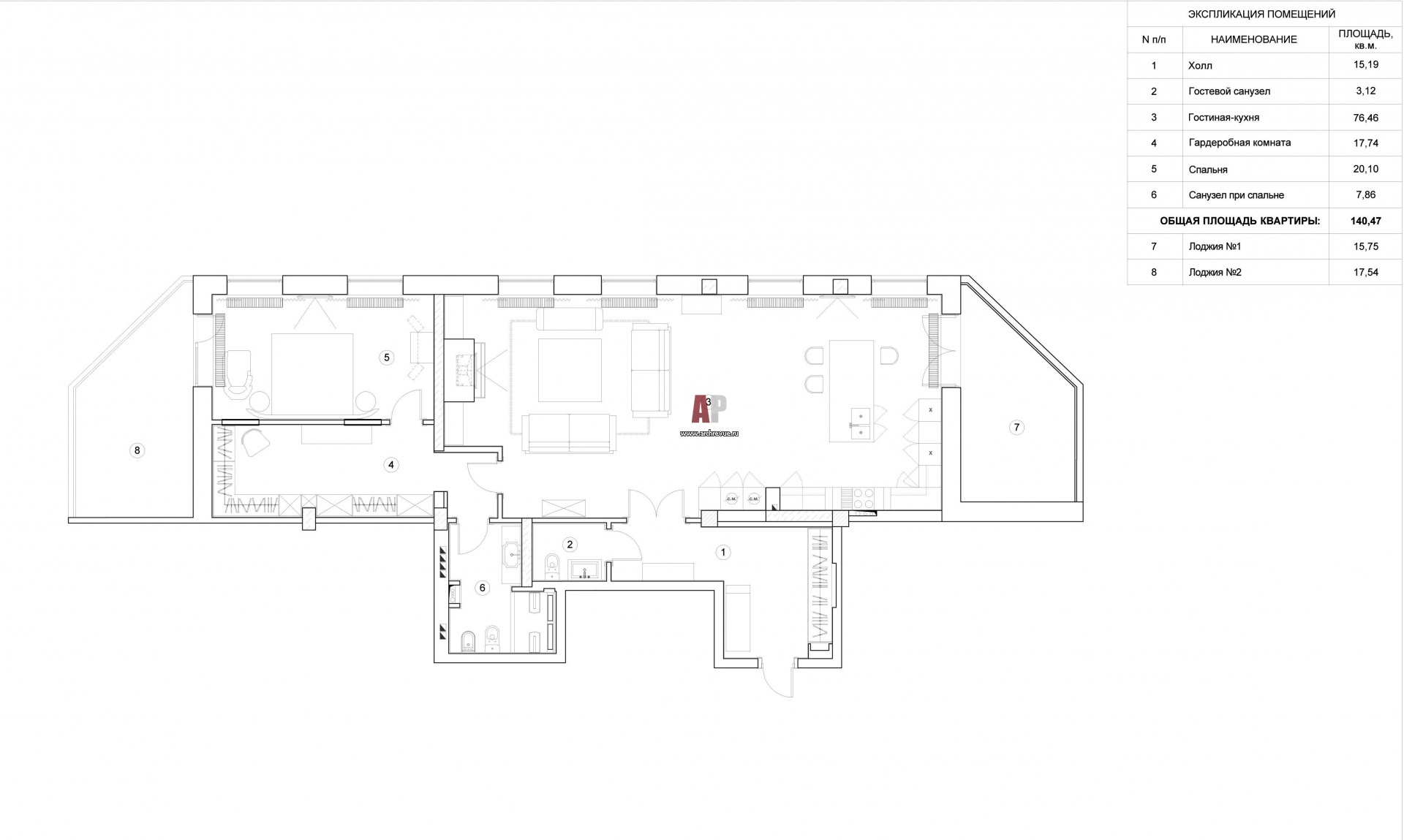 Планировка пентхауса площадью 140 кв. м с двумя открытыми лоджиями.