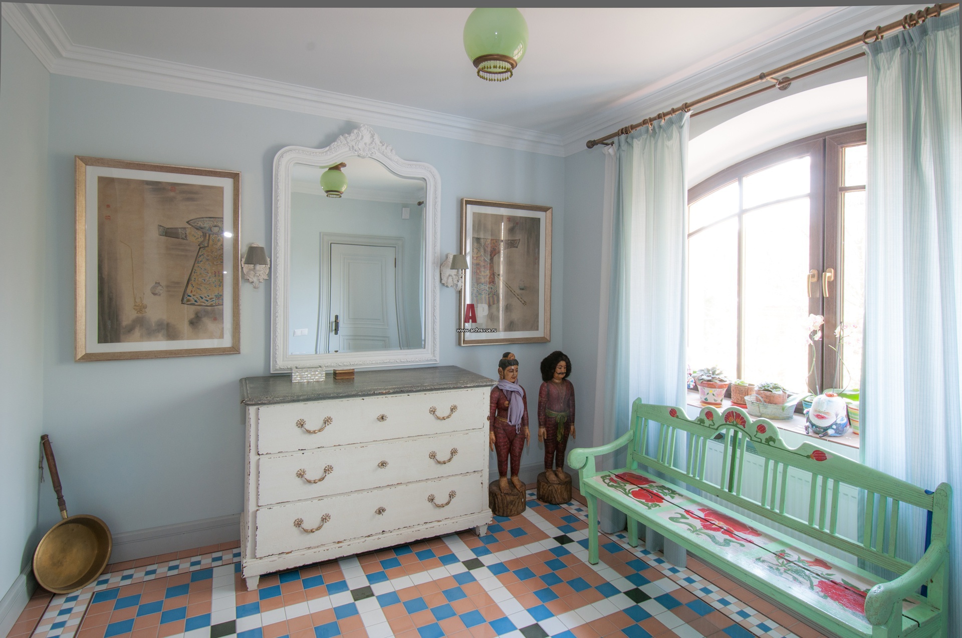 Интерьер прихожей. На полу – панно из разноцветной плитки от фабрики Ceramica Bardelli. Расписная лавка куплена на блошином рынке в Москве.