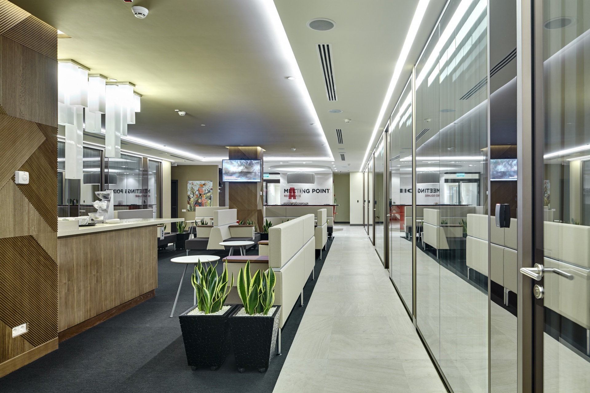 Фото интерьера современного коворкинг-центра класса премиум. Стеклянные перегородки с матированием, имитирующим драпировку штор.