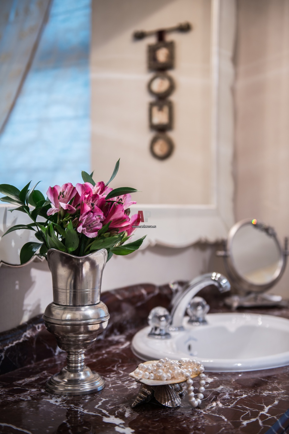 Интерьер главной ванной комнаты. Столешница раковины выполнена из коричнево-бордового мрамора с белыми прожилками.