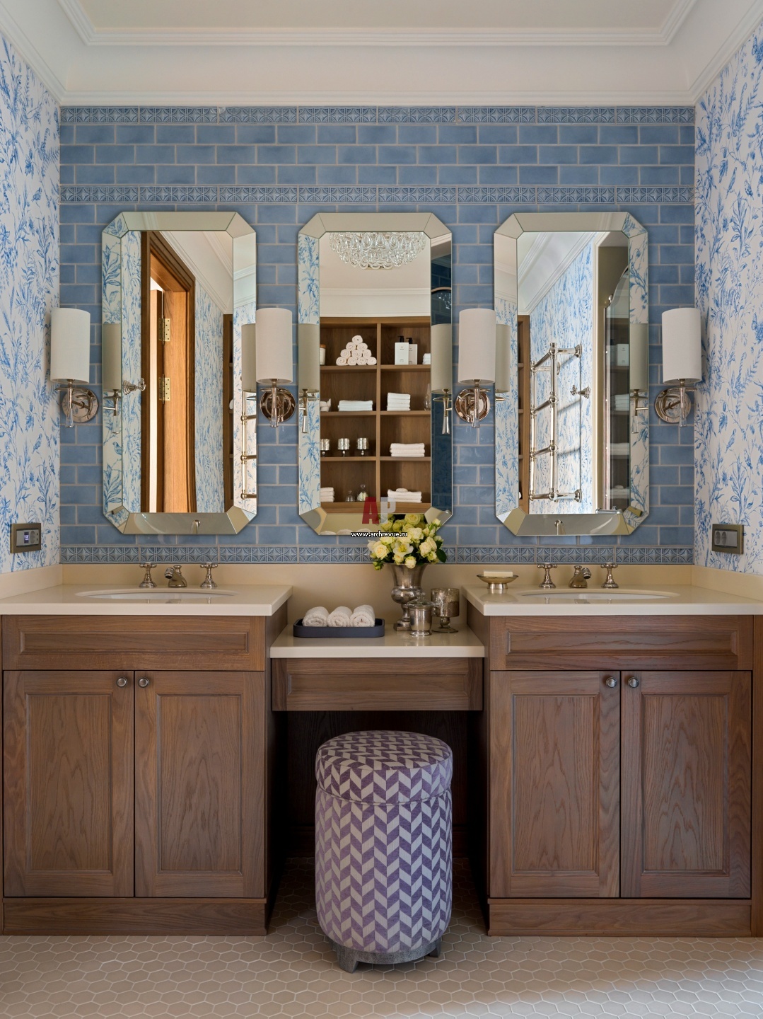 Хозяйский санузел. На стенах – обои с рисунком Ralph Lauren и голубая глазурованная плитка Original Style. Тумбы под раковины сделаны из дерева с натуральной текстурой. Раковины, Villeroy & Boch. Бра и люстра, Visual Comfort & Co.