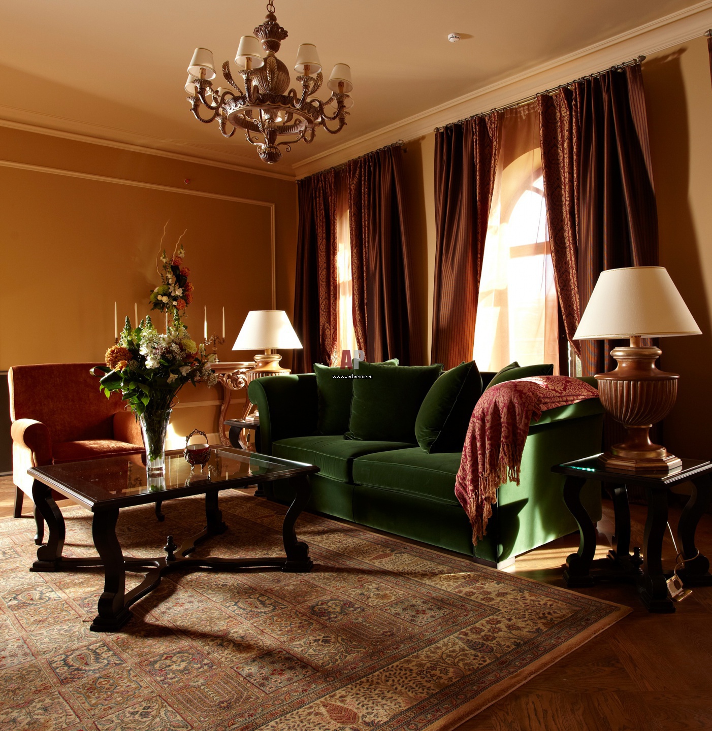 Номера отеля меблированы итальянской мебелью. В интерьере преобладают бархатные обивки и текстиль красного и зеленого цветов.