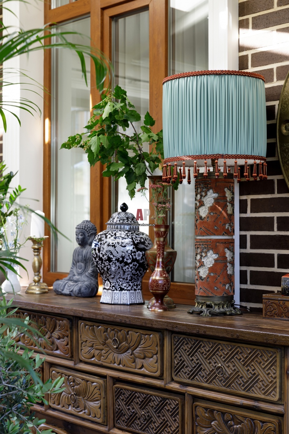 Камерный английский особняк с элементами колониального стиля. Интерьер зимнего сада. Этнические предметы из Индии и Индонезии.