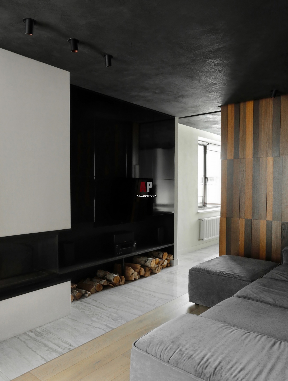 Интерьер дома строится на контрасте. Потолок в гостиной сделан черным, пол – светлым. Напротив дивана, рядом с экраном ТВ есть камин с двухсторонней топкой. Пламя видно из зоны отдыха и из столовой.