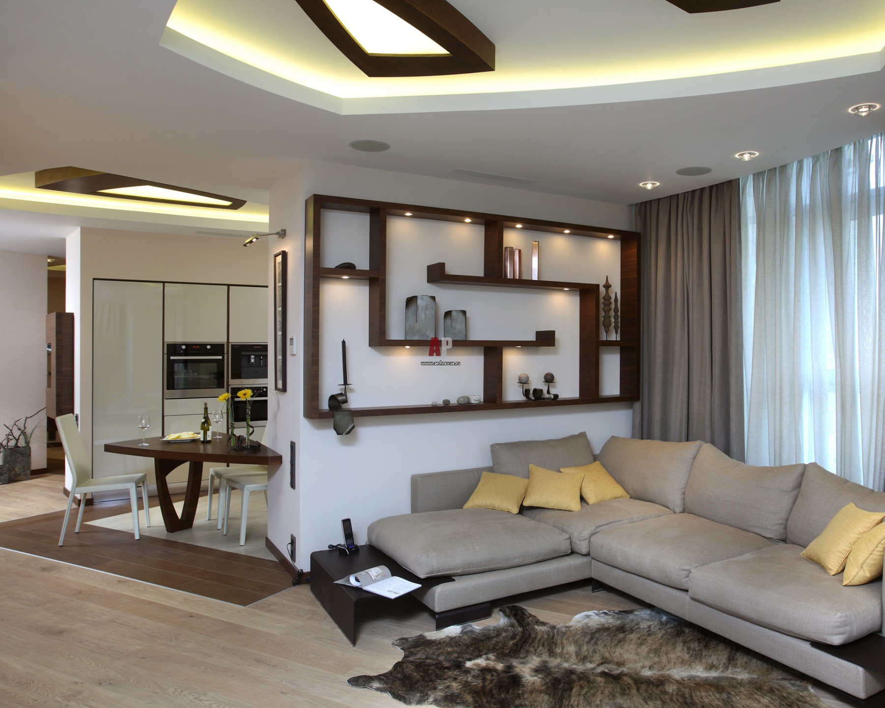 Интерьер гостиной-студии с настроением солнечного теплого дня. Диванная и столовая группы выделены многоуровневыми потолками с треугольными светильниками разного размера. Плоские фонари из матового стекла в массивных рамах из темного дерева отвлекают от сложной геометрии помещения с пространственным сдвигом, выступающими углами и округлыми линиями. На полу – массивная доска из выбеленного ясеня, поставщик «Мир Паркета». В зоне столовой ее сменяет керамогранит под дерево.