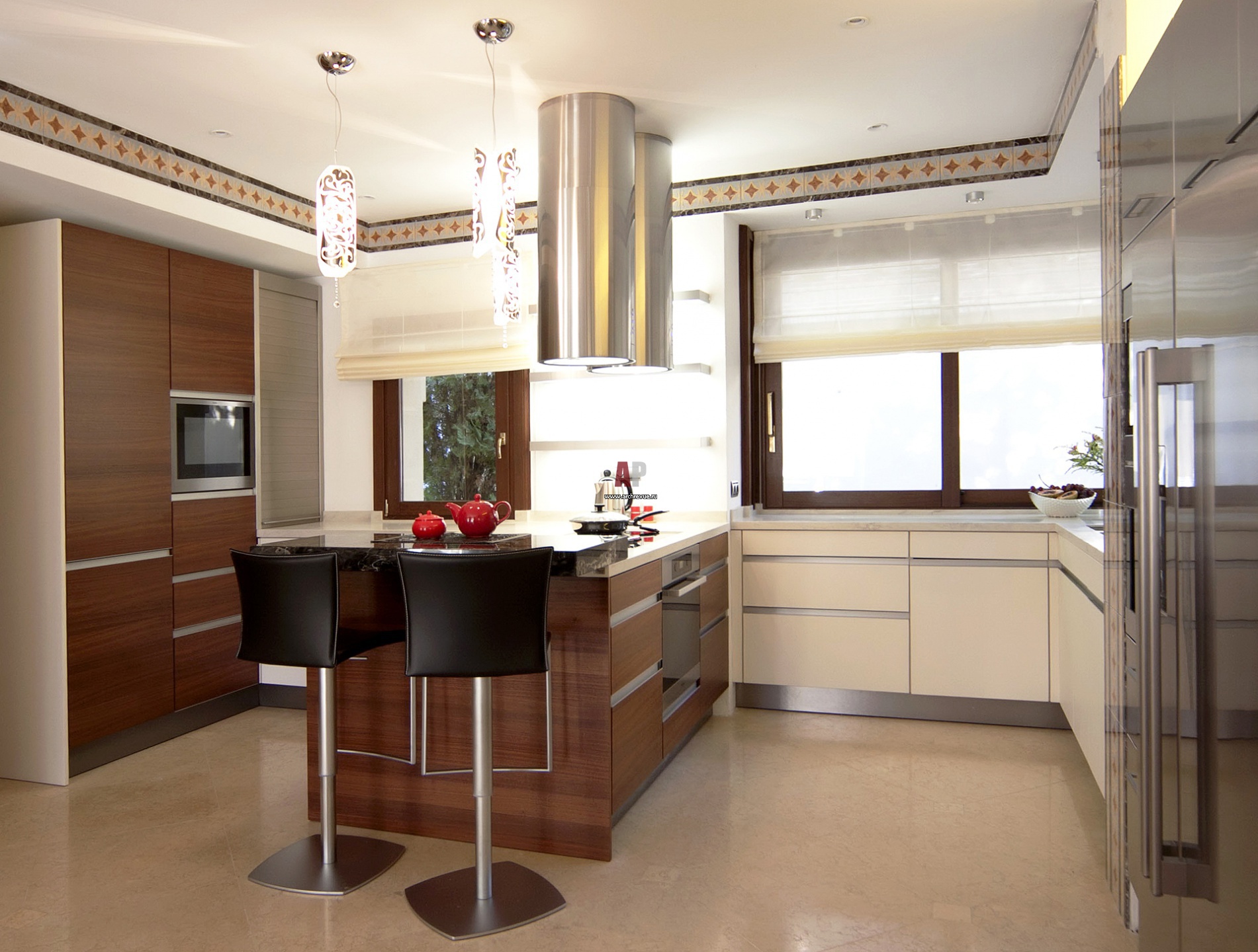Интерьер кухни решен в современном ключе. Кухонный гарнитур, SieMatic. Вытяжка из хромированного металла над барным островом.