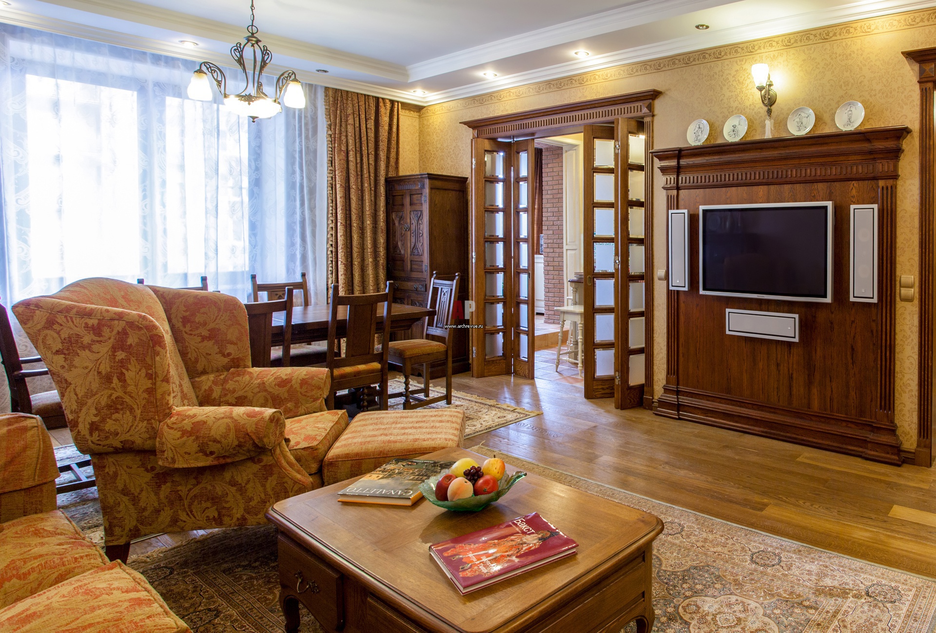 Интерьер гостиной с классическими английскими мотивами. Бумажные обои золотисто-желтого цвета, столярные изделия и мебель из моренного дуба. Светильники и карнизы для штор выполнены в технике литья. Лепные карнизы Orac Decor, поставщик «Ампир Декор».