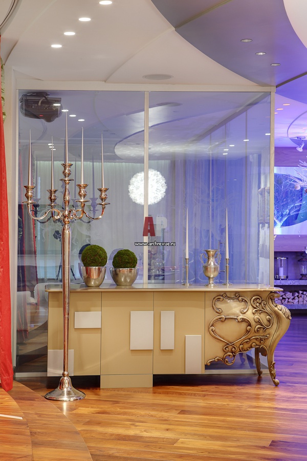 Со стеклянными перегородками домашнего кинотеатра рифмуется оригинальный комод Emmemobili. Его эклектичный дизайн сочетает в себе приметы барокко и конструктивизма.
