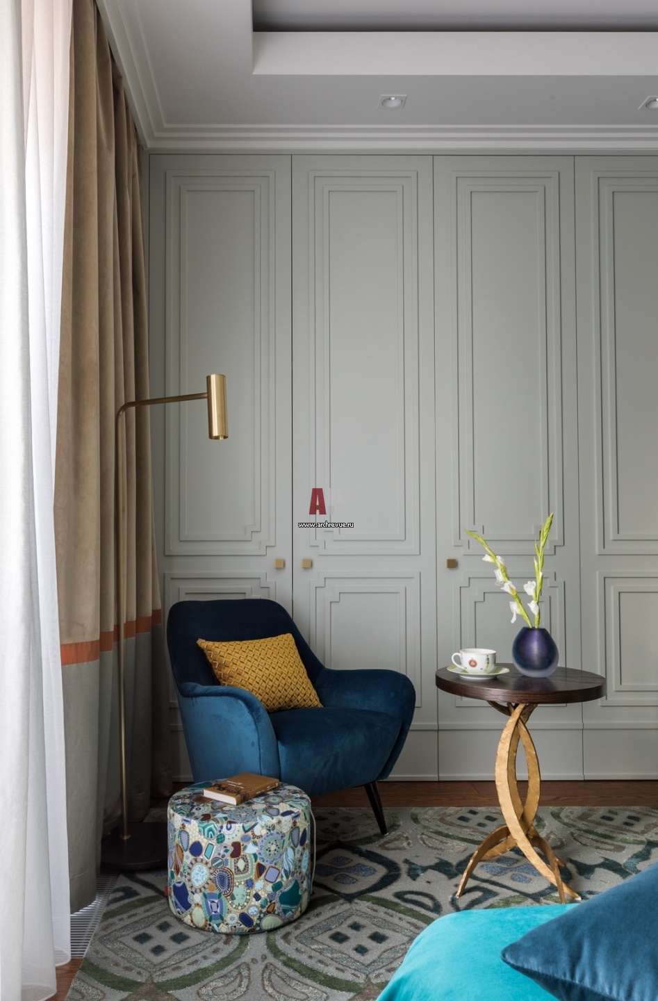 Рабочее место хозяйки находится в одном из корпусов встроенного шкафа. Для дверей и стеновых панелей был разработан единый стиль с уникальной геометрией и рисунком линий, он объединяет все помещения квартиры. Кресло, Vibieffe. Журнальный столик, Porta Romana.