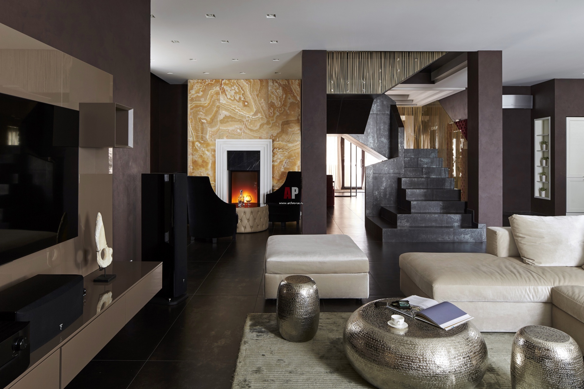 Портал камина – цельный слэб медового оникса на всю высоту помещения. Кресла у камина, Casamilano. Журнальный столик, DV homecollection.