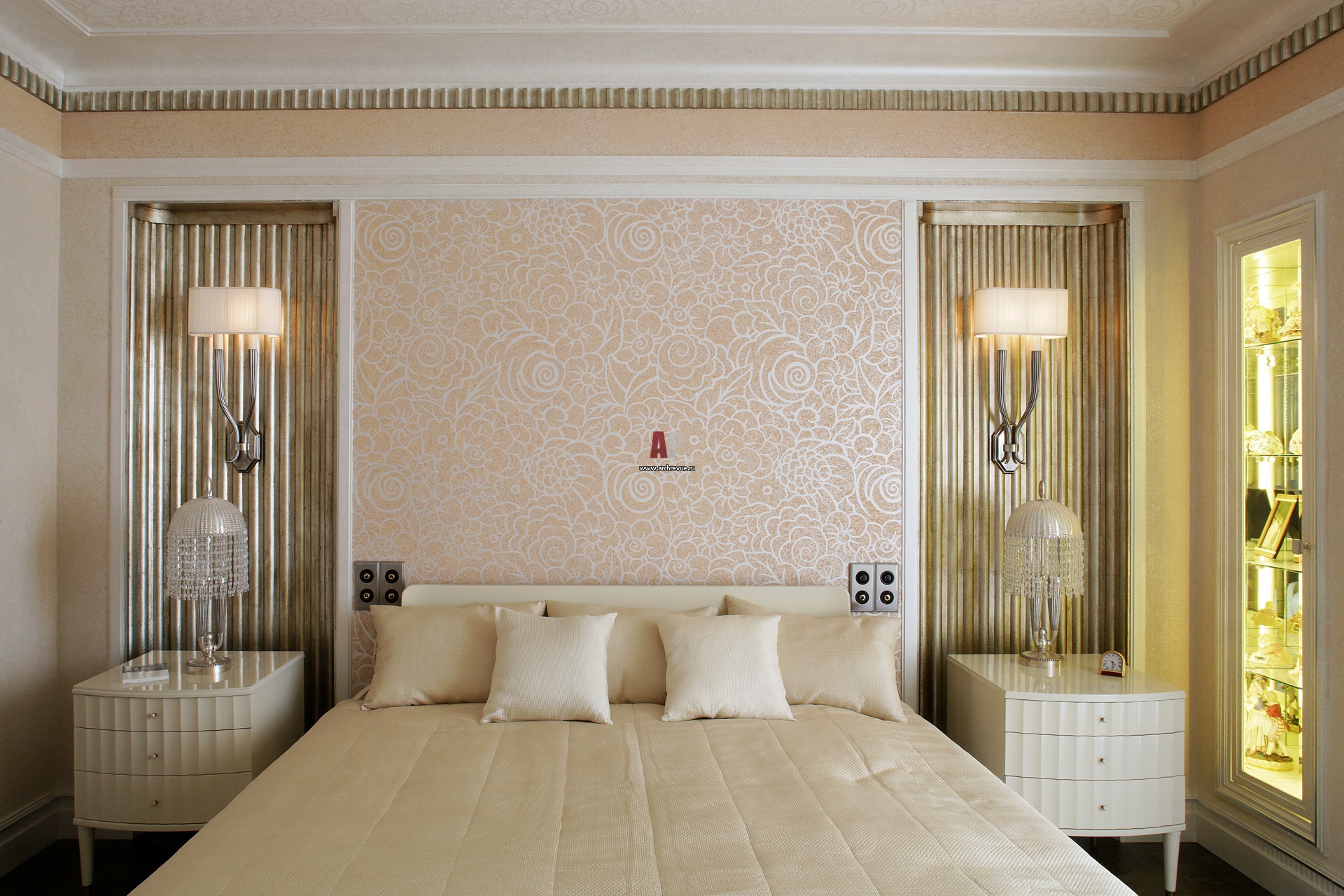 На фото – интерьер спальни. Рисунок потолочного карниза повторяется в отделе ниш золотыми каннелюрами. Настольные лампы по обе стороны от кровати из серебра и хрусталя сделаны по эскизам архитекторов.