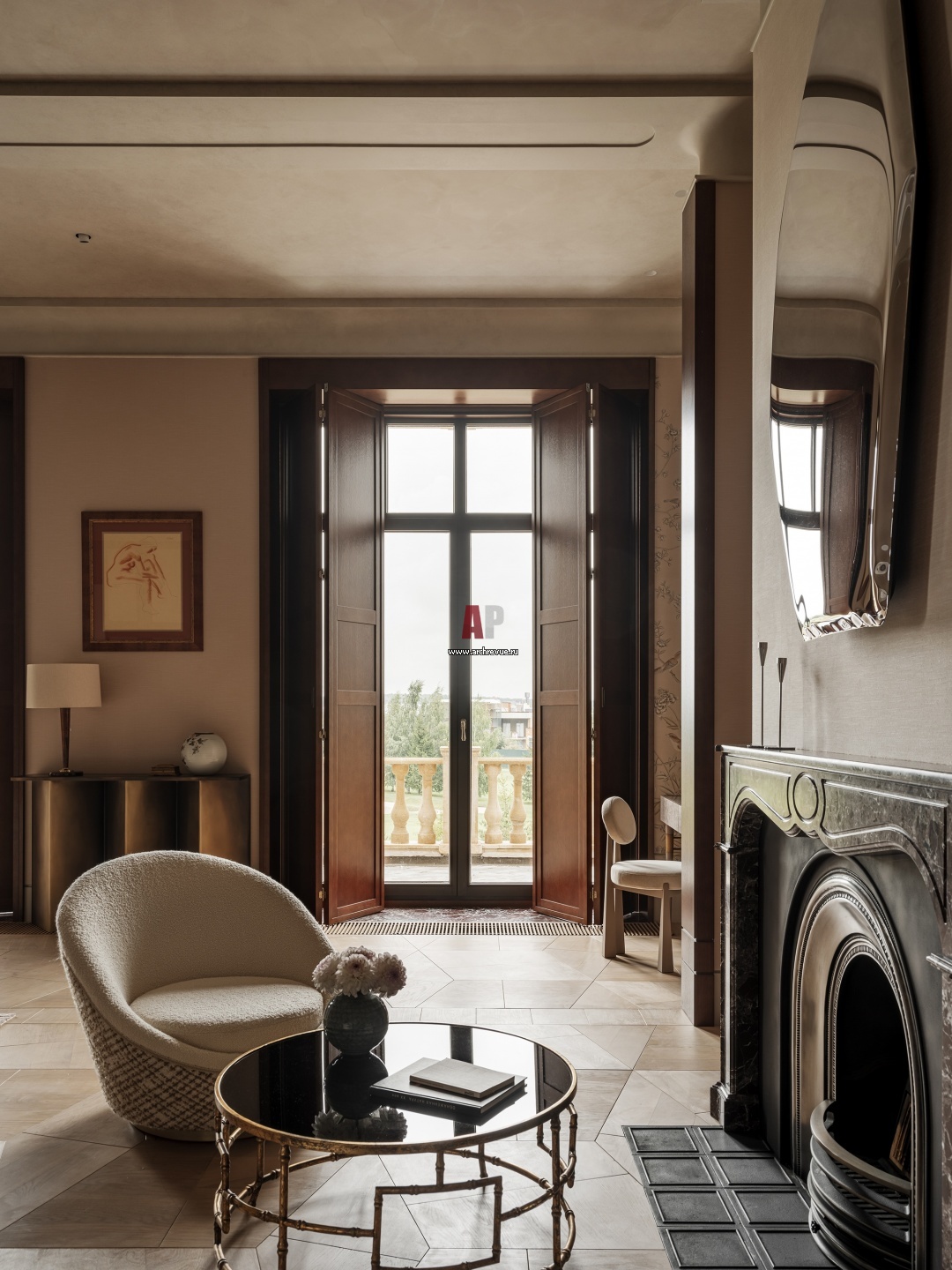 Роскошная резиденция с элементами ар-деко. Паркетная доска в авторской раскладке и оконные шаттерсы выполнены в темном тонированном шпоне. Работа на стене – Георгий Артемов «Сидящая обнаженная», начало 1930-х гг.