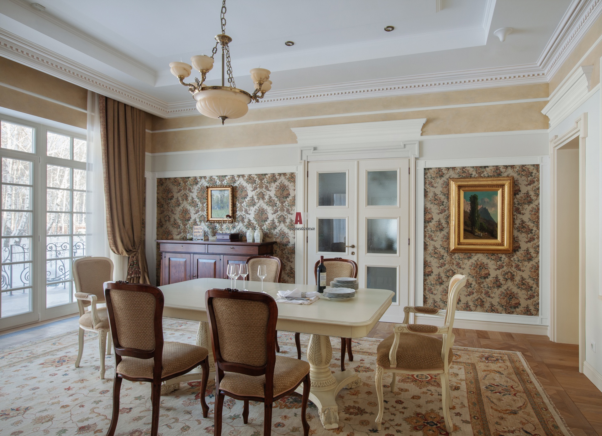 Фото интерьера классической столовой с цветочным орнаментом обоев.