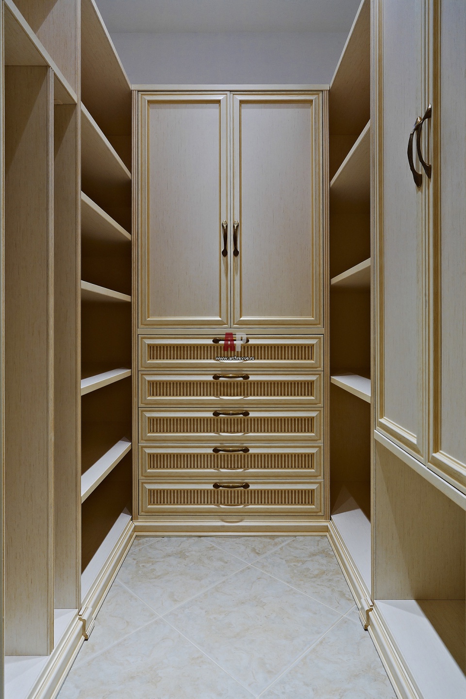 На фото – дизайн гардеробной комнаты в квартире. Системы хранения в гардеробной сделаны из светлого дерева.