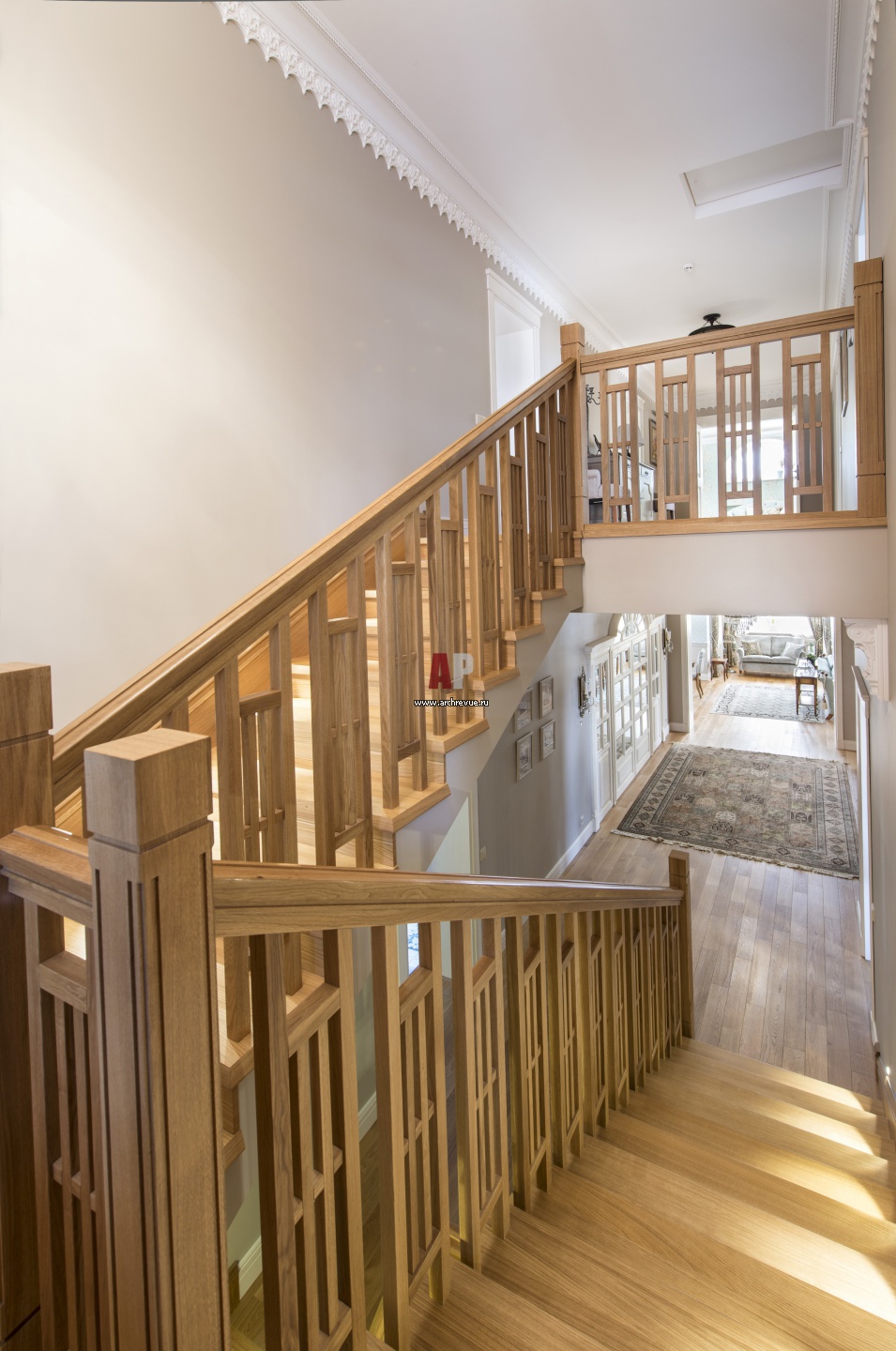 Лестница в английском доме примыкает к стене. Ступени и ограждение в духе работ Чарльза Рени Макинтоша выполнены из светлого дуба.