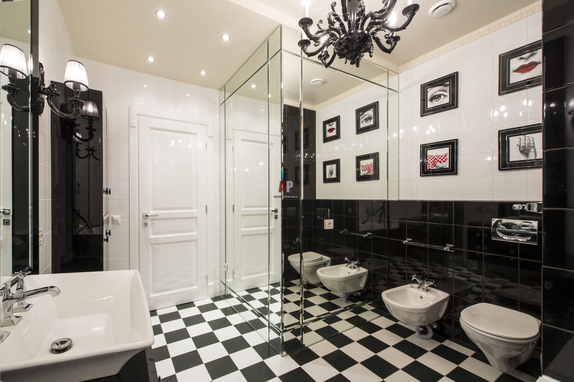 Интерьер черно-белого санузла. Сантехника, Milldue. Душевая кабина вынесена в зеркальный куб.