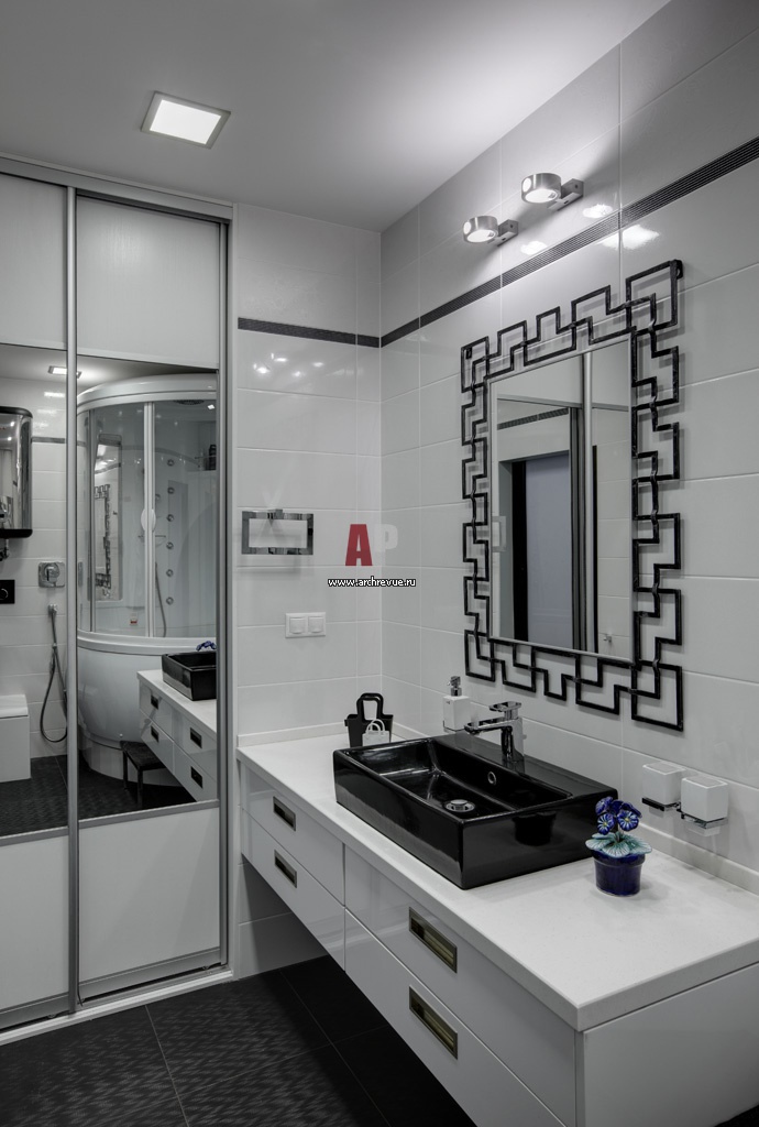 На фото – интерьер хозяйской ванной комнаты. Белая плитка и мебель для ванных комнат служат фоном для черного санфаянса и авангардного зеркала в черной раме. Сантехника, Villeroy & Boch.