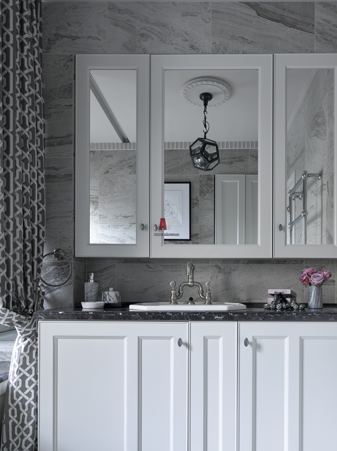 Умывальник в классическом стиле выполнен на заказ. Под раковиной встроена стиральная машина. Зеркальный шкаф утоплен в конструктивную нишу. Раковина, Duravit. Смеситель, аксессуары, Nicolazzi.