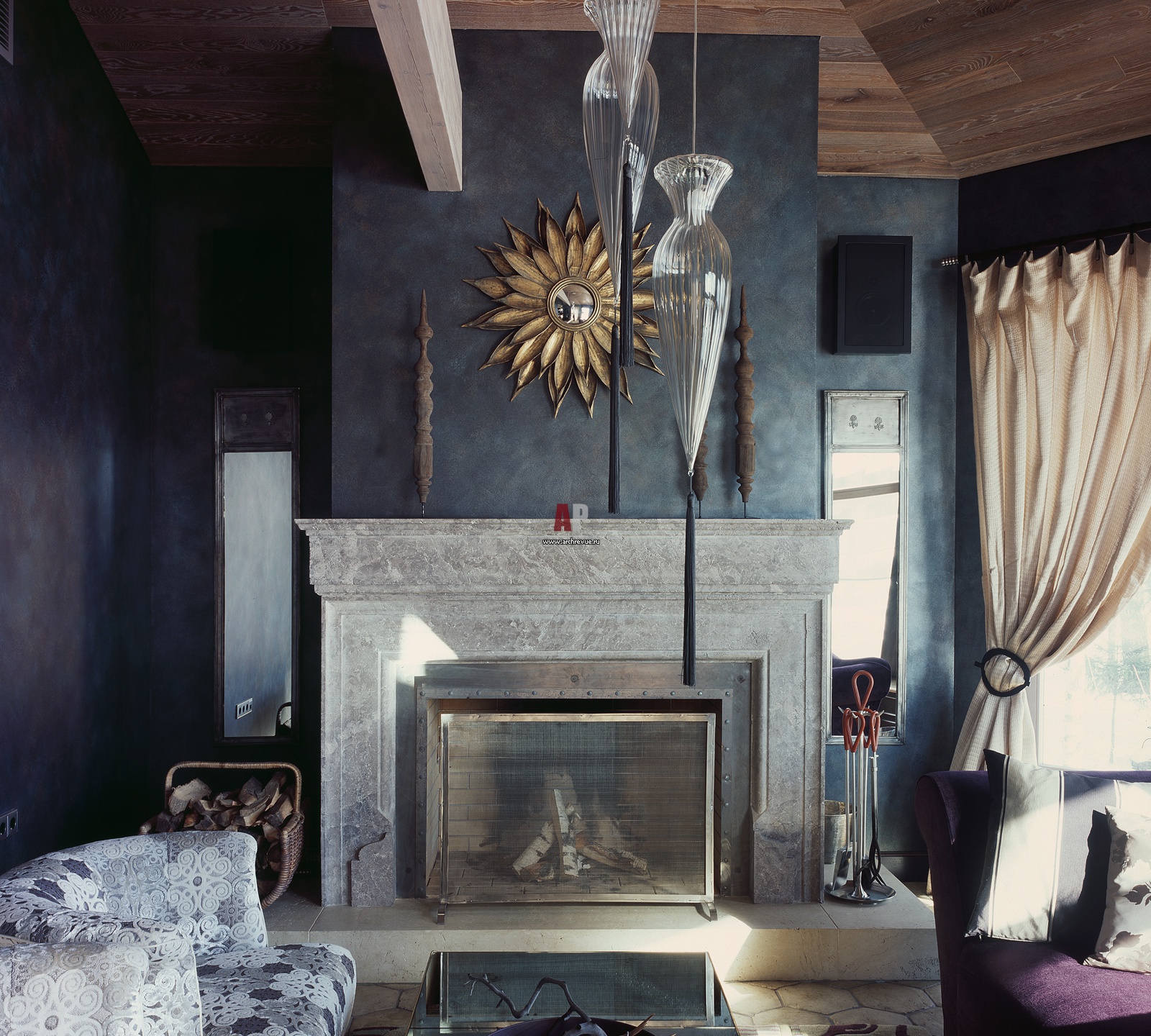 Портал камина выполнен из оселкового мрамора, компания «Виньола». С ним перекликается декоративная штукатурка серого оттенка с фактурой камня, поставщик «Дом Краски / Деко – Эм». Пол перед камином выложен восьмигранниками из травертина. Шторы Ulf Moritz. Диван и кресла Fendi. Ковер Roche Bobois. Столик с зеркальной столешницей Baxter.