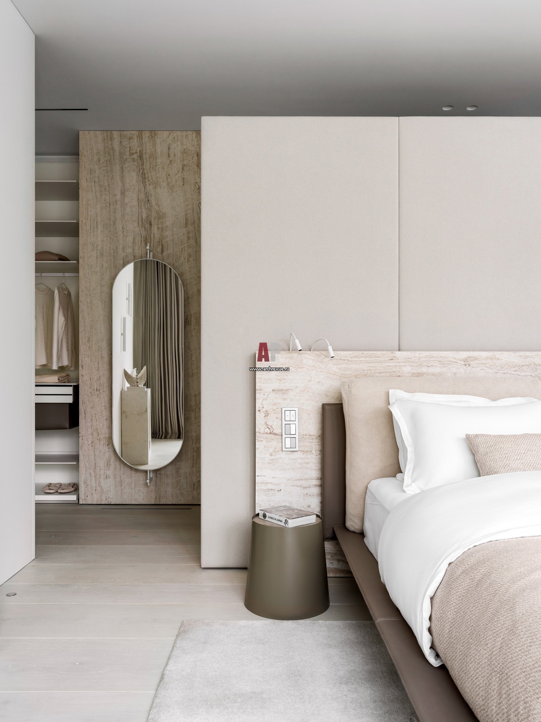 Спальня имеет сквозную планировку. Кровать обращена к окну и расположена по центру. За перегородкой – проходы в гардеробные и санузлы (мужской и женский).