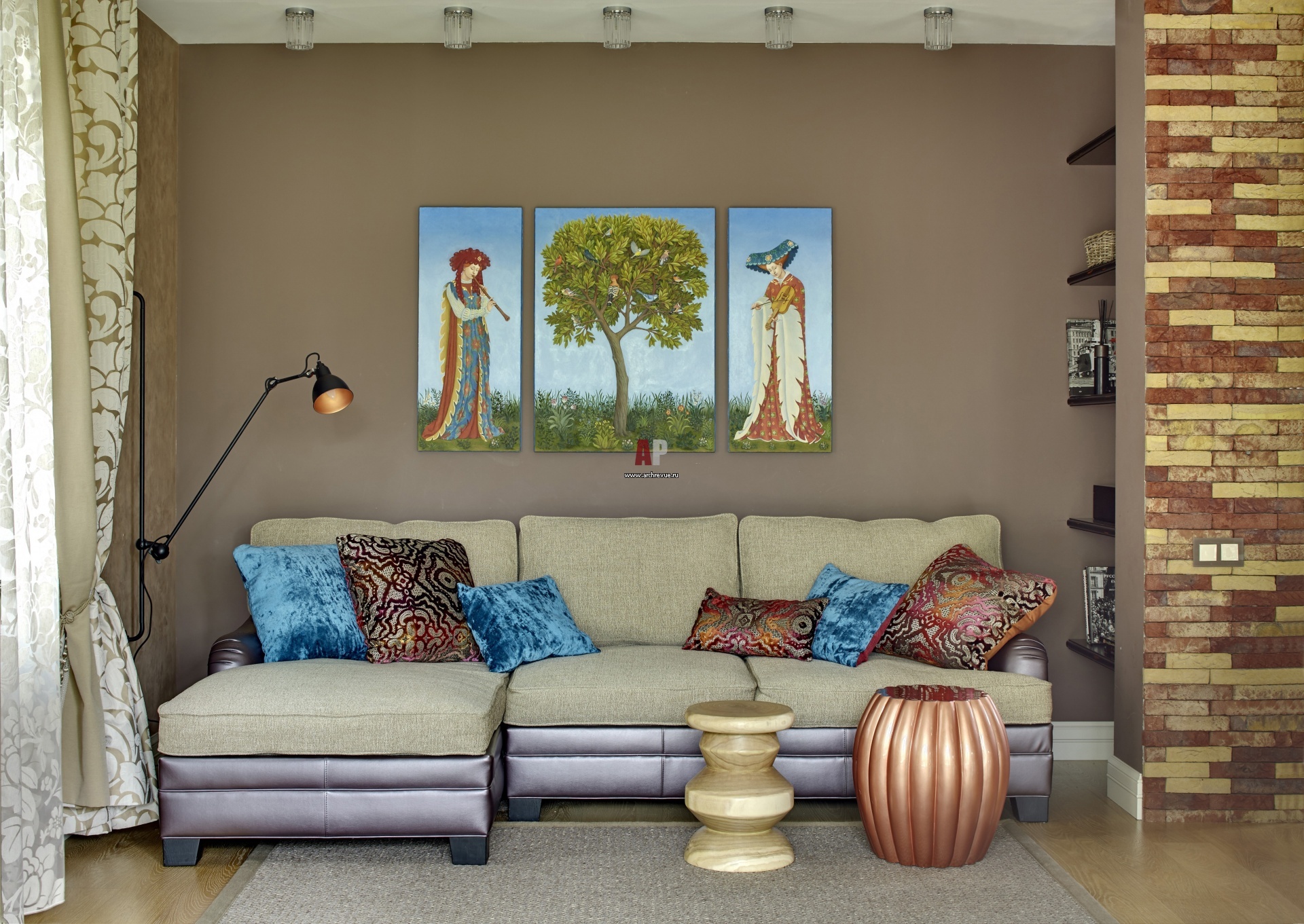 Стены первого этажа частично оформлены венецианской штукатуркой. В интерьере использованы картины по мотивам средневековых фресок из замка Манта и миниатюр из Манесского кодекса.