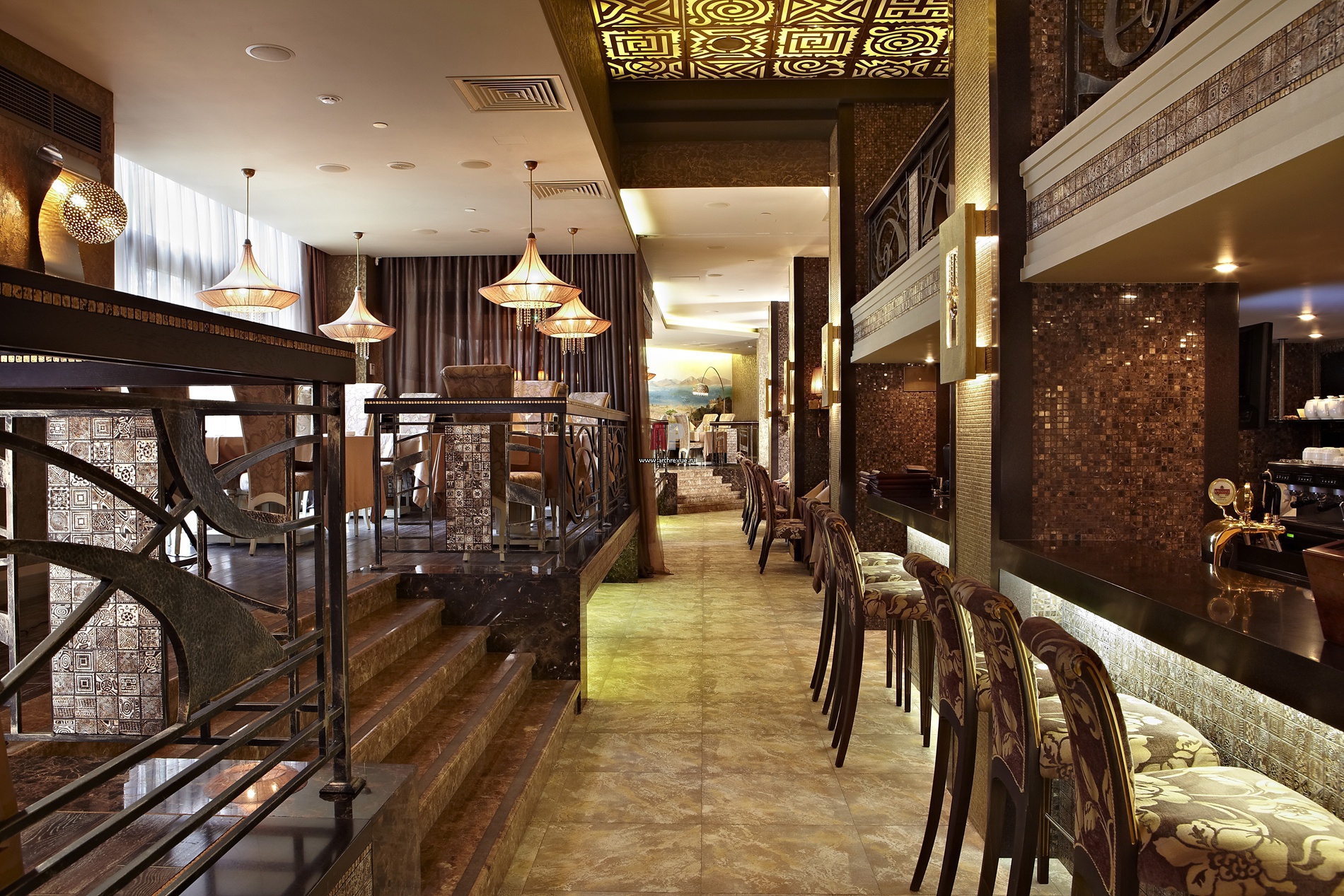 Ограждение подиума выполнено из патинированного металла, изготовление Vladesta Studio. Фантазийный орнамент был придуман авторами проекта. Ведущие на подиум ступени облицованы мрамором сорта «Имперадор», поставщик «ГрАнтик».