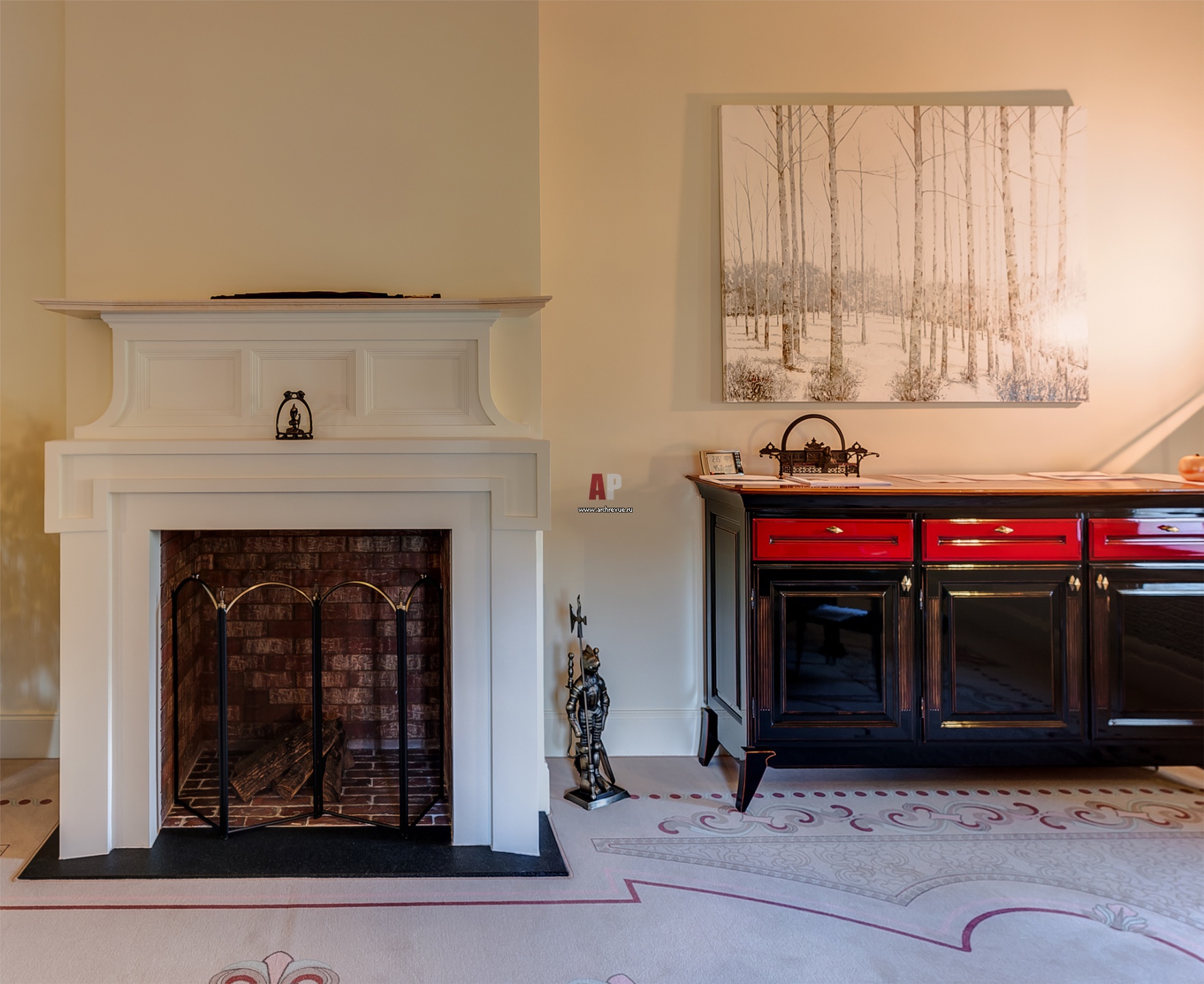Фото камина в интерьере рабочего кабинета. Гипсовый портал камина сделан на заказ в духе классических образцов. Каминная решетка из черного металла с золотом.