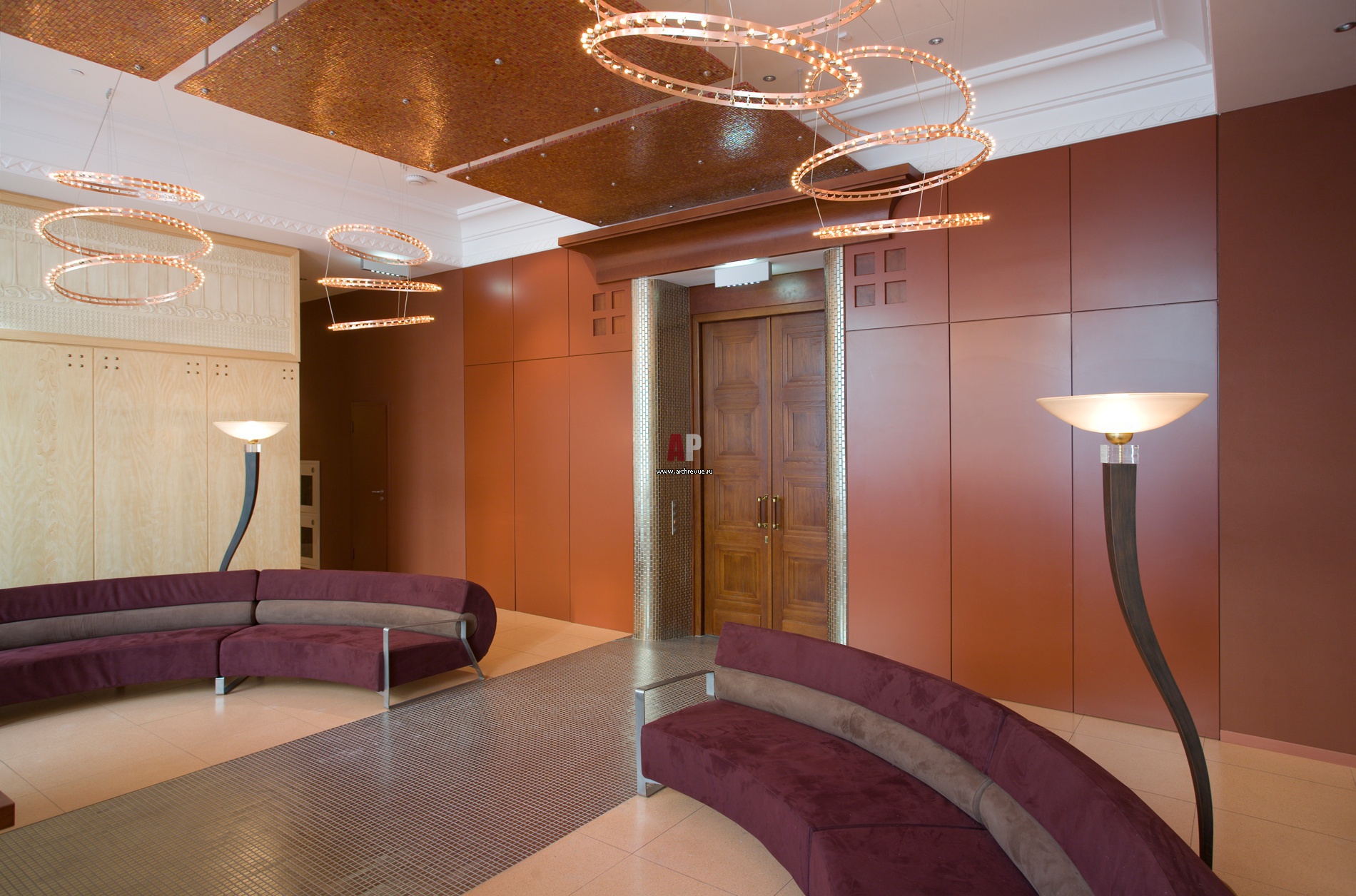 Входная дверь выполнена из дуба и полностью повторяет историческую, какая была во времена Шехтеля. Входная зона акцентирована перламутровой мозаикой в форме маленьких кирпичиков. Ею оформлен дверной проем и пол.