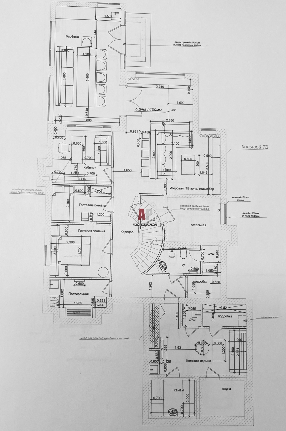 План цокольного этажа трехэтажного семейного дома. Общая площадь – 300 кв. м.