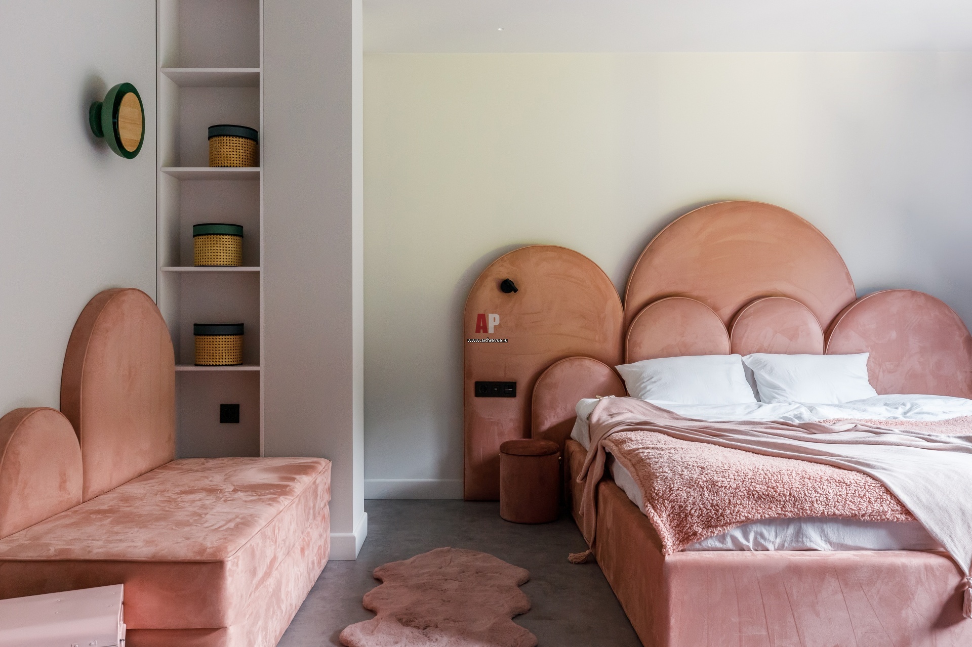 Вторая детская комната. Кровати и кушетки выполнены на заказ, они обиты уютным плюшем пыльного розового цвета.