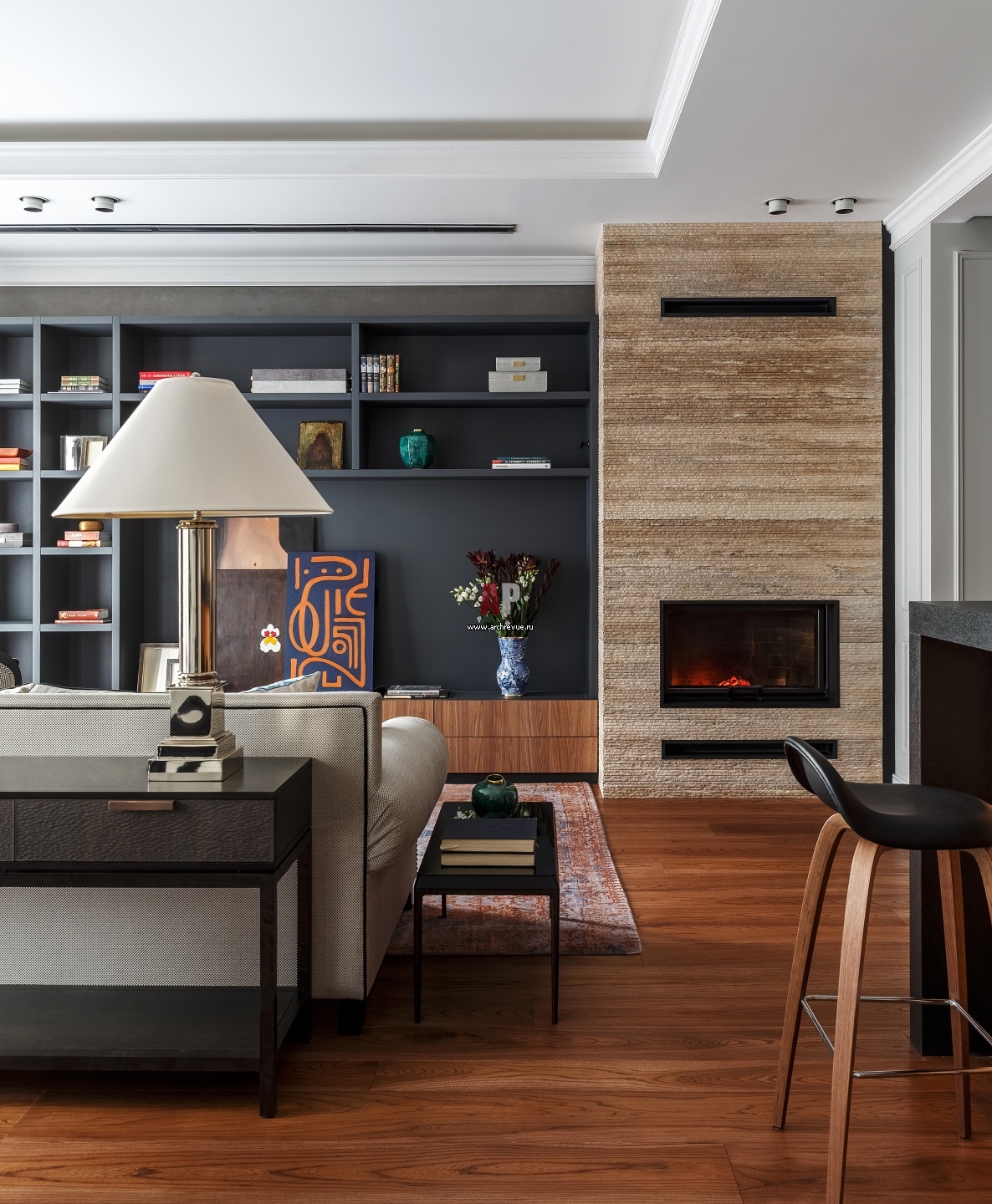 В гостиной спроектирован дровяной камин с живым огнем. Облицовка камина пиленым камнем перекликается с оформлением входной группы жилого комплекса «Литератор». Кресло, столик, Ralph Lauren.