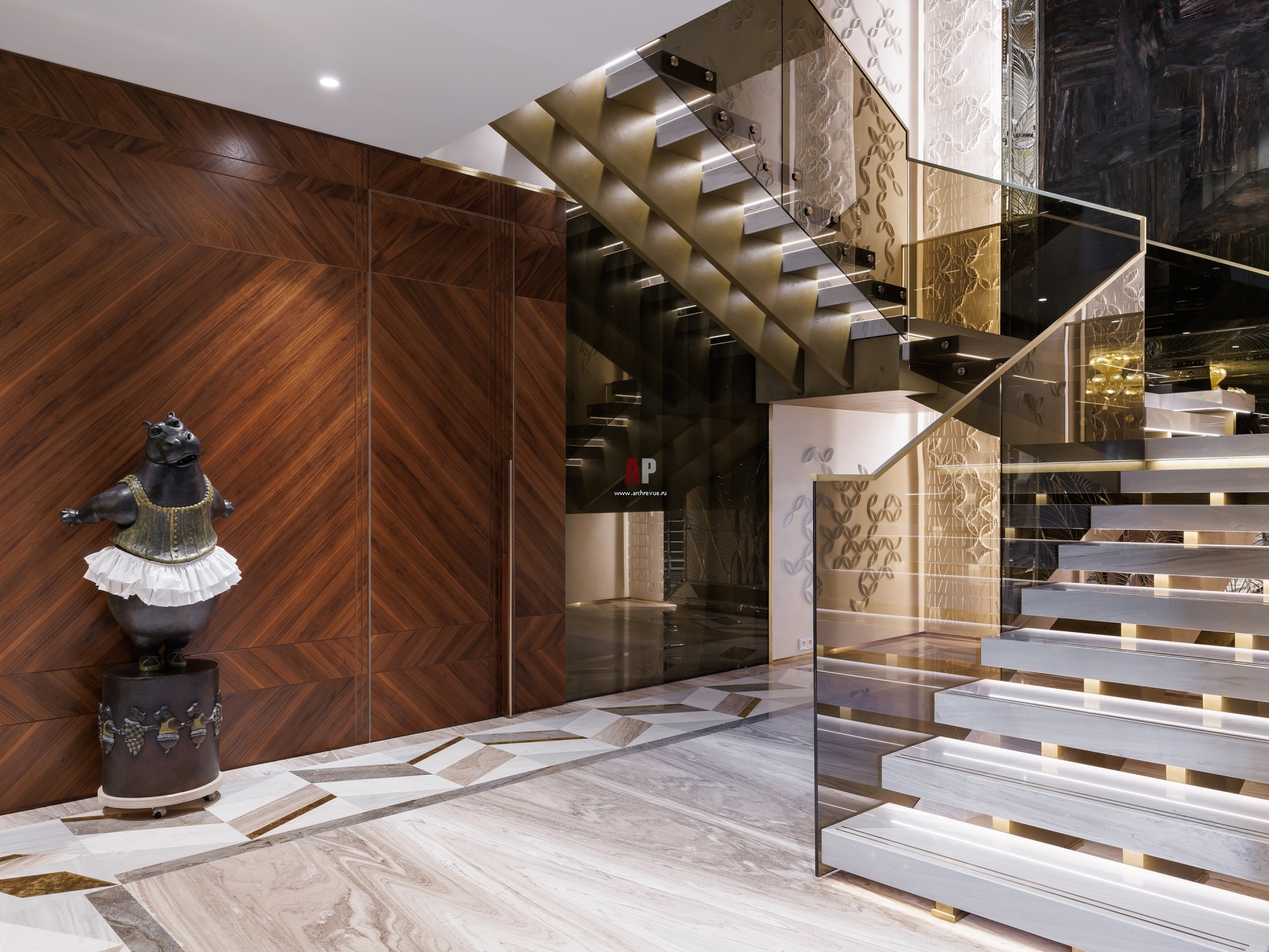 Парадный лестничный холл. Стены зашиты панелями из шпона ореха в геометрической раскладке. Пол выложен слэбами из мрамора, мраморный бордюр выполнен в технике флорентийской мозаики. Современный арт-объект – скульптура датского художника Bjorn Okholm Skaarup «Hippo Ballerina», бронза, 2019.