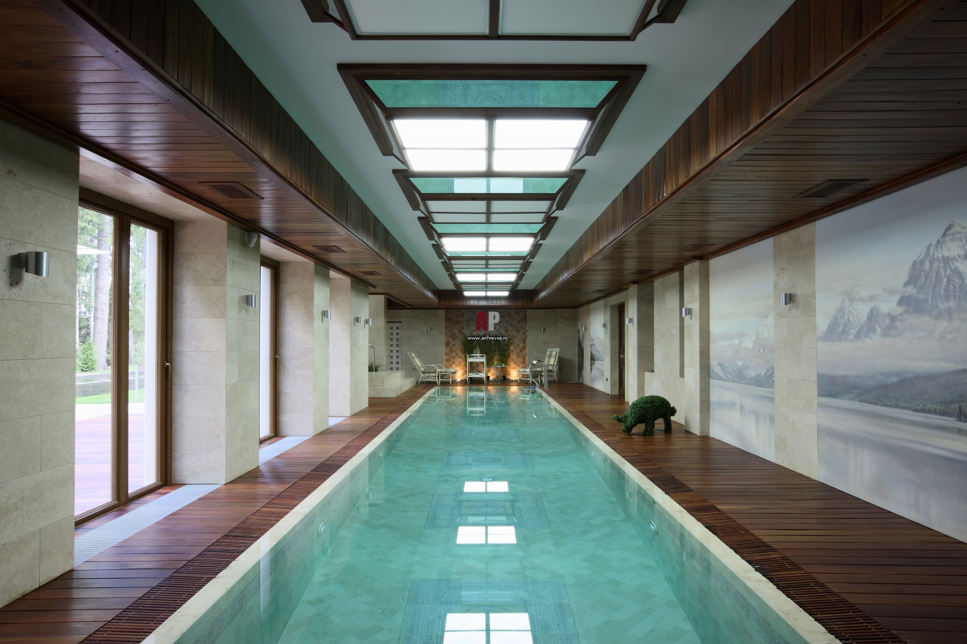 На нижнем уровне дома находится бассейн длиной 20 метров. Отделка чаши бассейна и стен выполнена из травертина и мраморной плитки, украшенной резным орнаментом. Для обшивки пола и потолка выбрана термостойкая древесина. Одну из стен украшает фреска. Ее писали по полеуретановым щитам влагоустойчивыми красками.