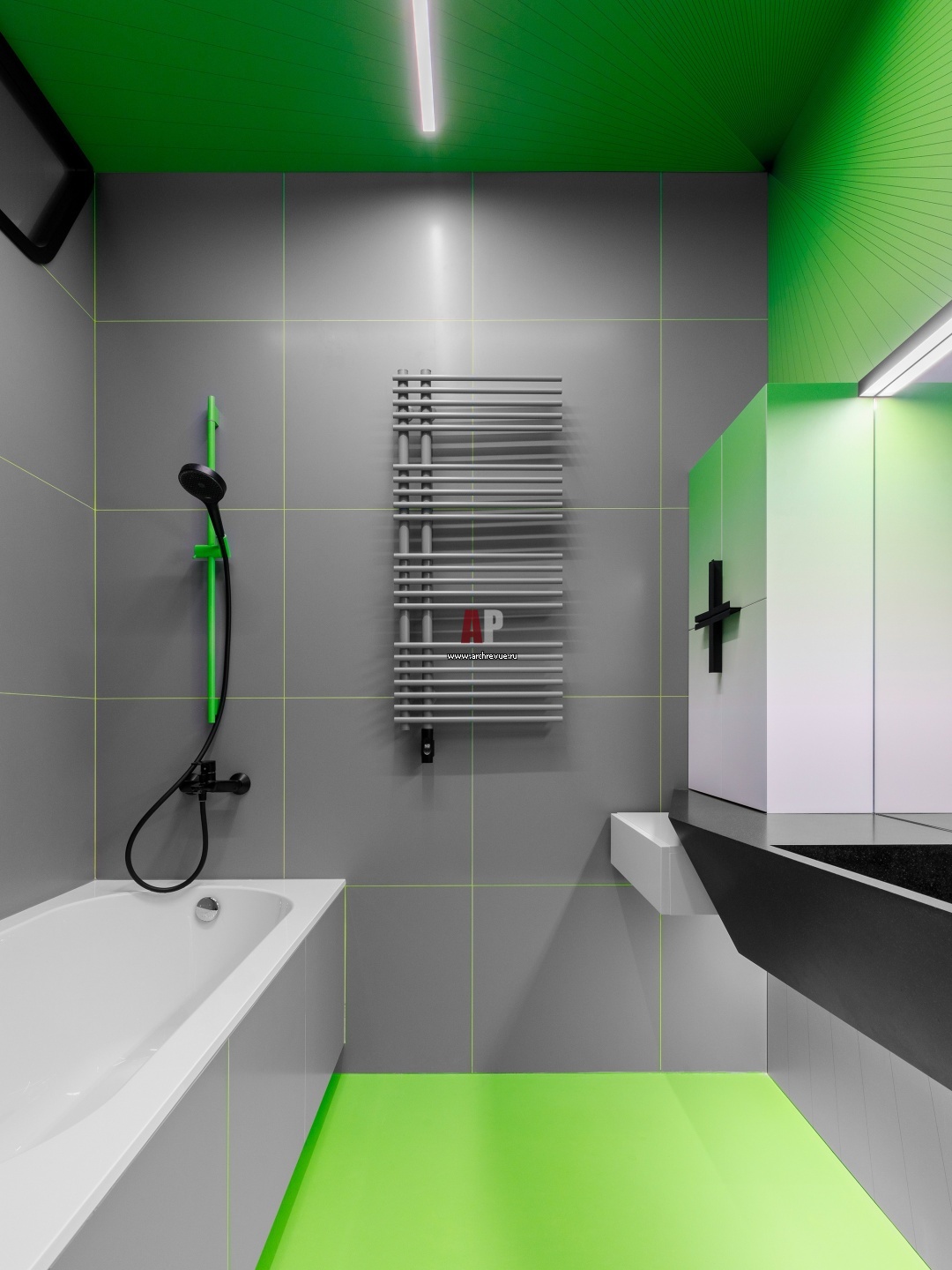 Декор ванной построен на контрасте темно-графитового и зеленого. Часть стен, примыкающих к ванне, отделаны керамогранитом с яркой затиркой. Стена напротив и потолок зашиты композитными панелями с УФ-печатью.