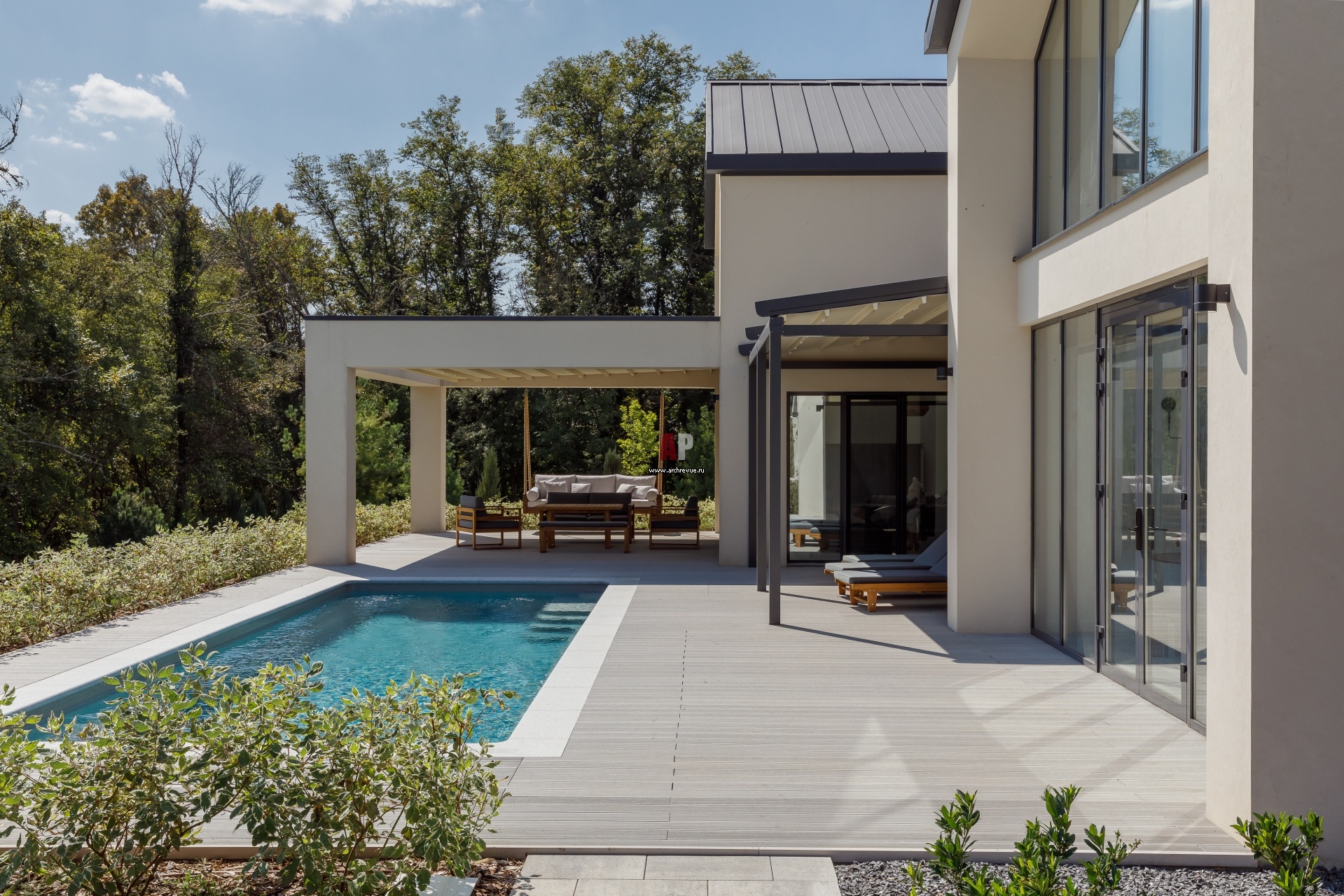 Участок площадью 32 сотки примыкает к лесу. На заднем дворе спроектирован открытый плавательный бассейн и патио, объединяющие две автономные постройки.