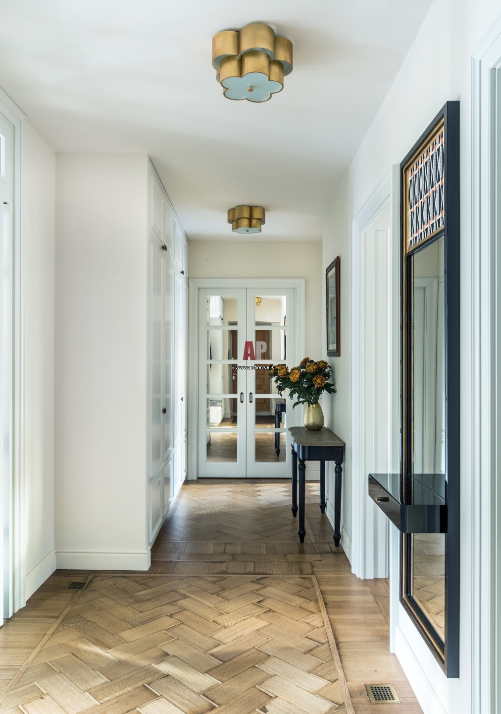 Входная зона. Старинный паркет требовал реставрации, тем более, что была проведена перепланировка с частичным сносом стен. Паркет снимали, поштучно перебирали и потом перекладывали в готовом пространстве. Недостающие детали компенсировали. Консоль, Dialma Brown. Светильники, Aerin.