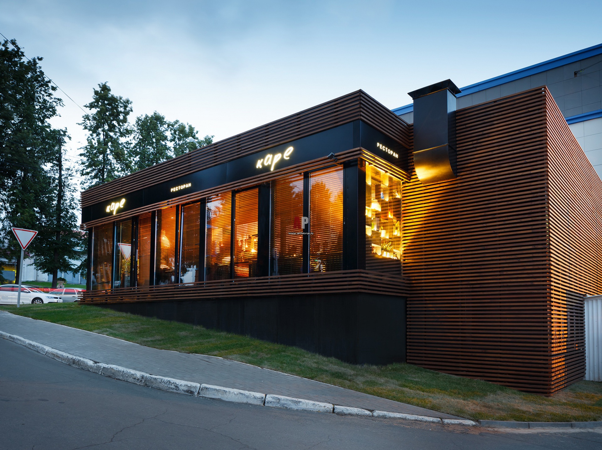 Отделка фасада деревянными панелями из лиственницы придает заведению в центре города сходство с ресторанами на природе.