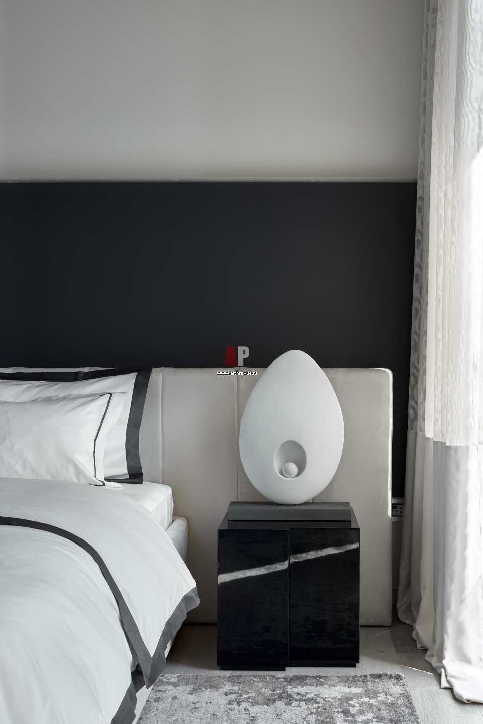 Квартира в эстетике минимализма. Интерьер спальни. Скульптура из камня, художник Сергей Соболев.