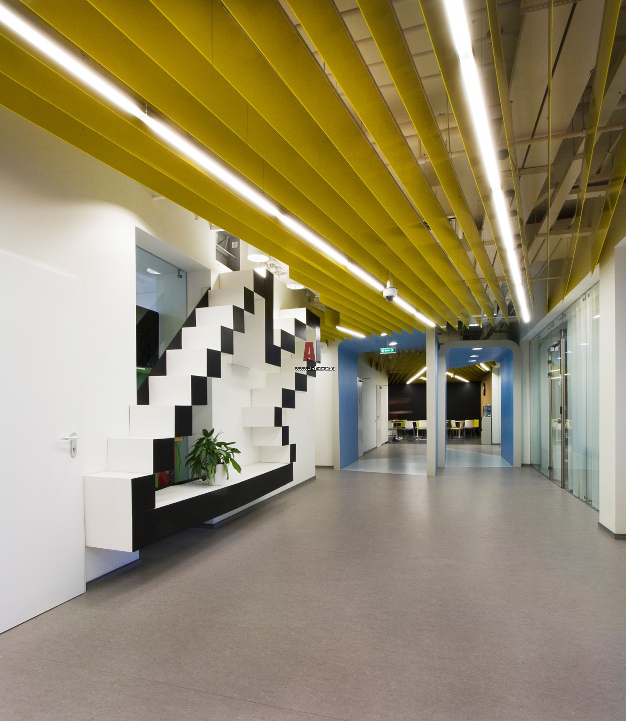 Интерьер холла. Потолок в офисе набран из оригинальных «ламелей», которые было крайне сложно монтировать. Авторы проекта Петр Зайцев, Арсений Борисенко, архитектурное бюро za bor.