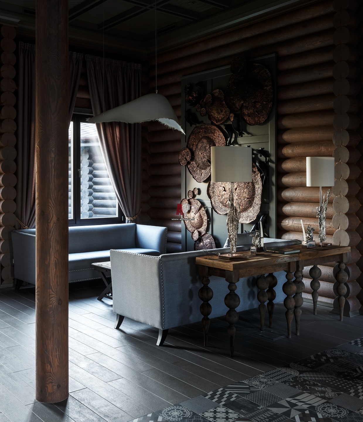 Зона отдыха в отеле. Бревенчатая стена сруба оформлена деревянным панно с инсталляцией из бронзы.