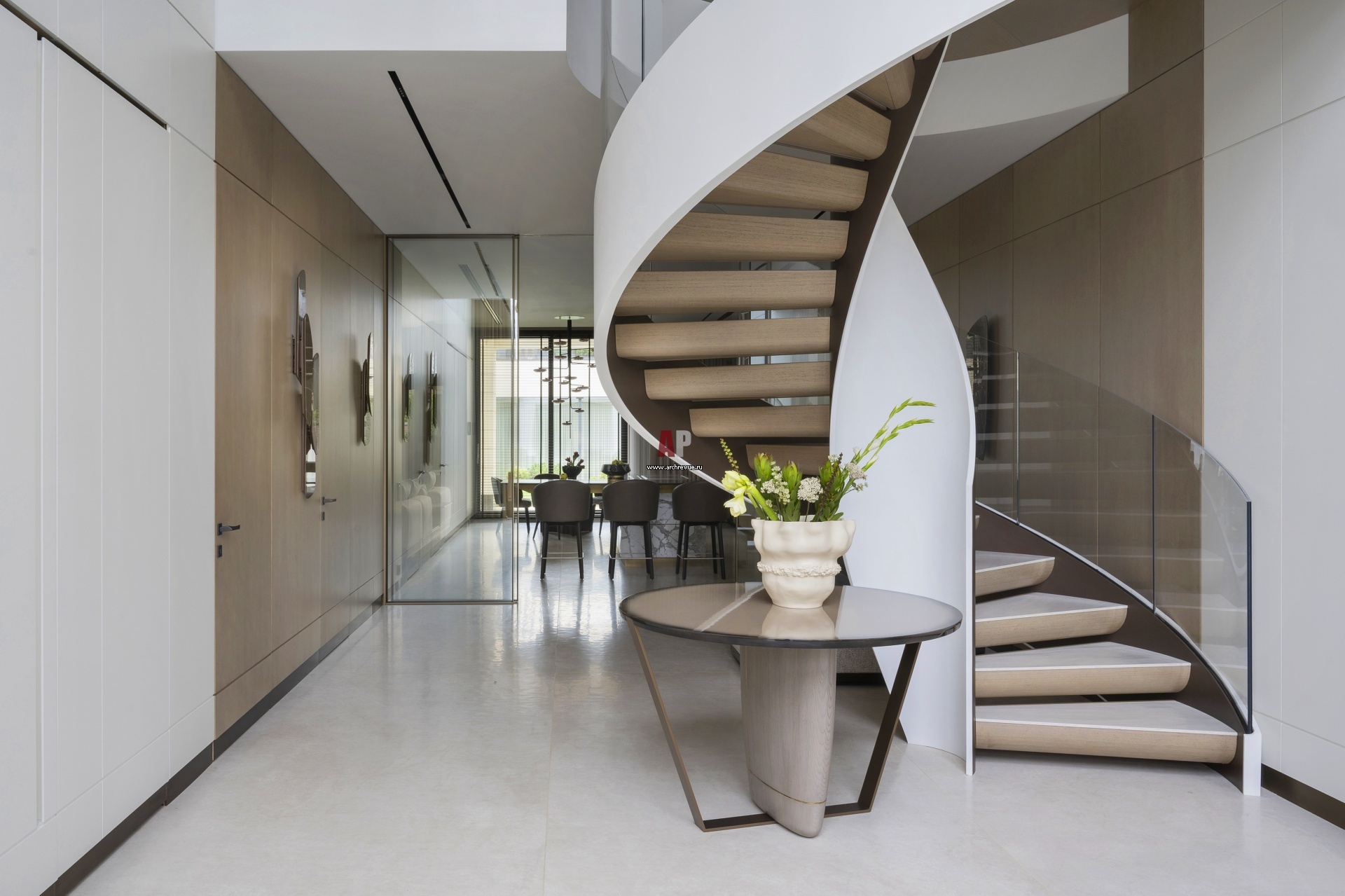Винтовая лестница выглядит ультрасовременно за счет облегченной конструкции, отделки тонким акриловым агломератом Grandex и оформлении внутренней части монолита по технологии «жидкого металла». Ограждение изготовлено из гнутого стела, а ступени имеют комфортную в эксплуатации форму лодочки.