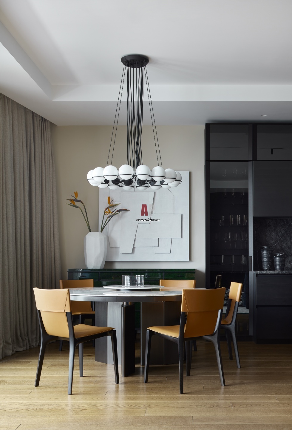 Столовая в общей гостиной. Обеденный стол из темного дерева с каменной столешницей, Minotti. Стулья из рыжей кожи, Poltrona Frau. Люстра над столом, Astep. Настенное панно сделано автором проекта.