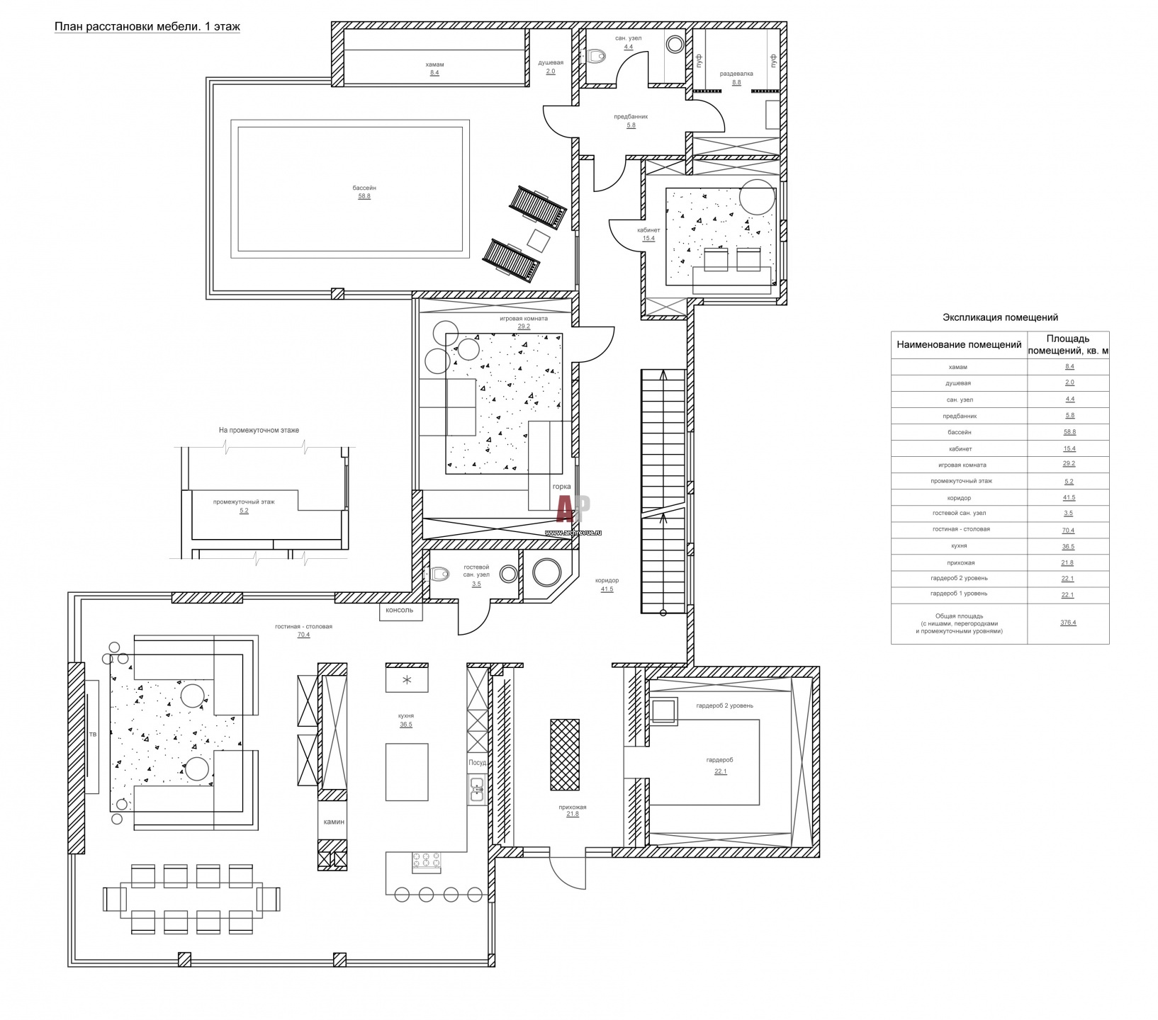 План первого этажа двухэтажного дома для большой семьи. Общая площадь – 700 кв. м.