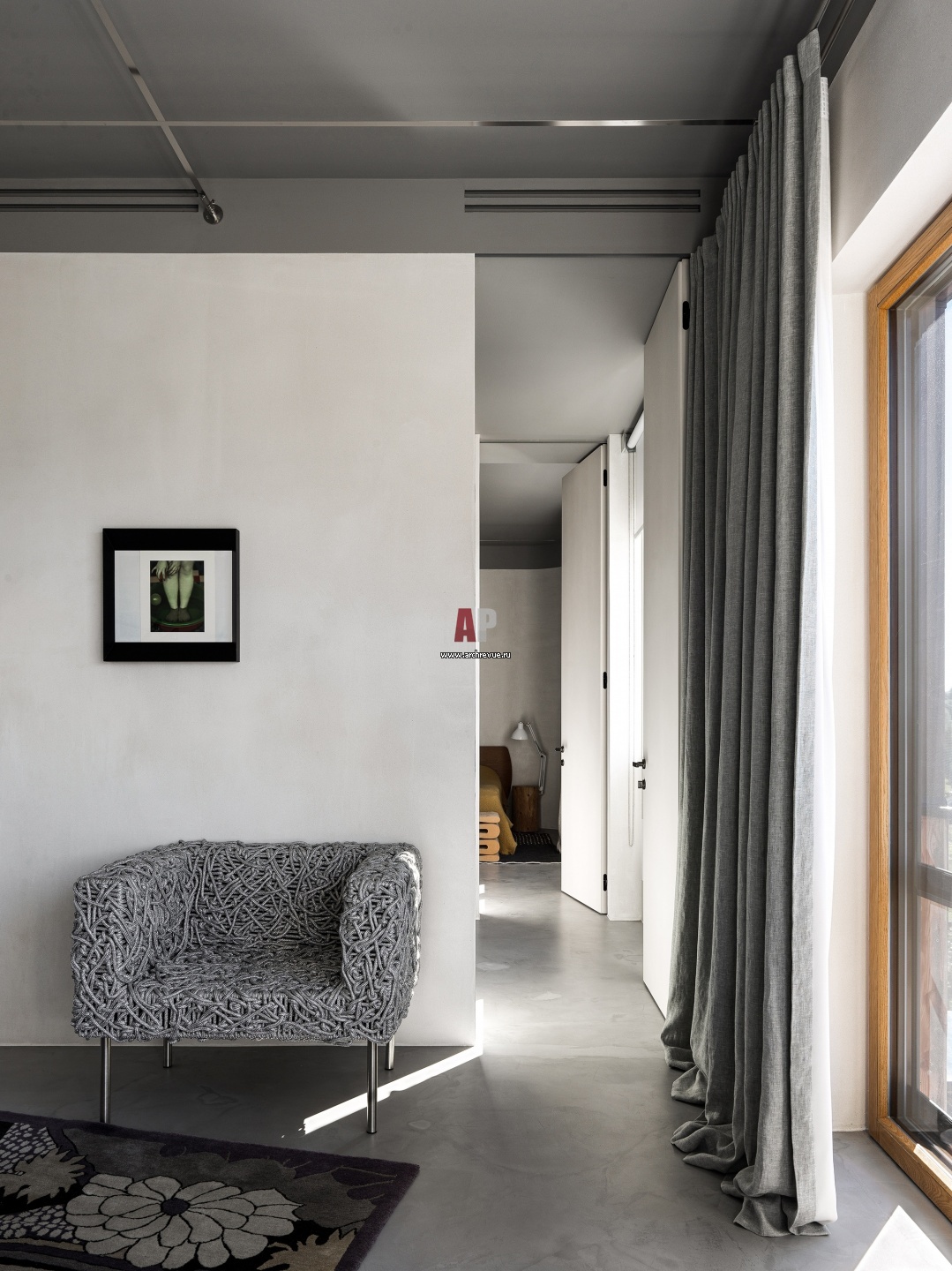 Фрагмент спальни. Кресло, Edra. На полу – микроцемент. Стены – песчано-цементная штукатурка.