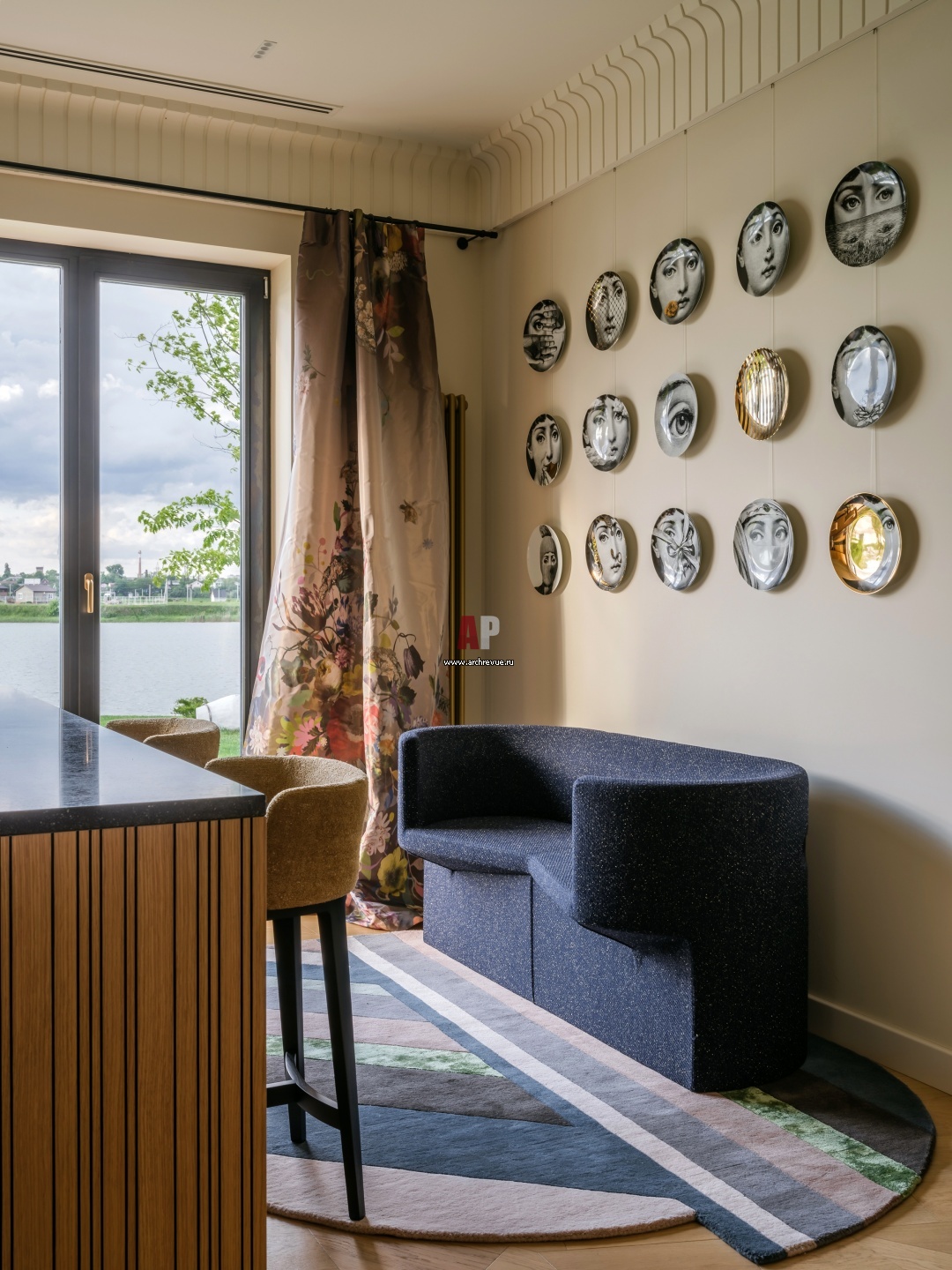 Зона для завтраков на кухне. Компактный диван необычной формы, ClassiCon. На стене – коллекция тарелок Форназетти.